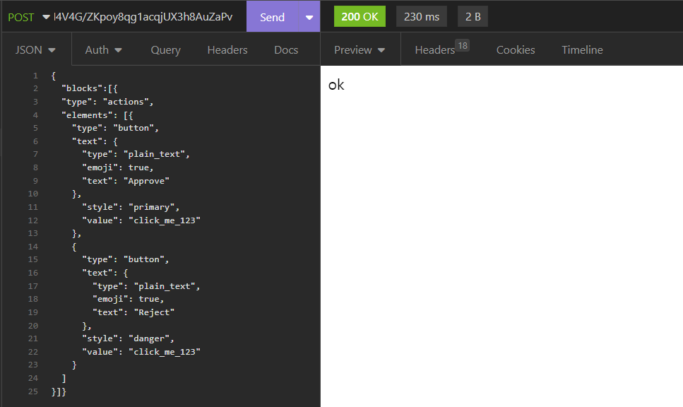 insomnia를 통해 슬랙 hooks로 rest api 테스트 결과 OK라는 응답을 받았다. 확인 결과 저 OK라는 결괏값은 content-type을 text/html 형식으로 응답하고 있었습니다.