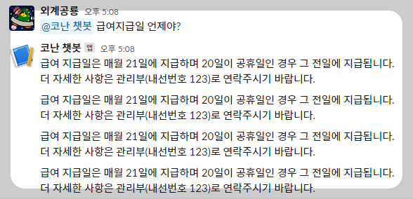 앞서 회고한 이슈들 외에도 챗봇마다 어떤 슬랙 채널에 게시할 것인지? 그리고 게시한 채널마다 생성되는 훅은 서버에 어떻게 저장할 것인지? 슬랙 block kit에서 제공하는 답변 포맷과 팀에서 사용하는 챗봇 빌더 답변 포맷을 어떻게 매핑할 것인지? 대화 이력 로깅은 어떻게 처리할 것인지? 등등 생각할 거리와 고려해야 될 부분이 많아 개발을 진행하는데 생각보다 많은 시간이 걸렸지만 그래도 생각보다 보람도 있고 재밌는 작업이었고 카카오, 슬랙 연동해봤으니 다음 플랫폼 연동은 그래도 좀 수월하게 해볼 수 있지 않을까 하는 생각이 듭니다.