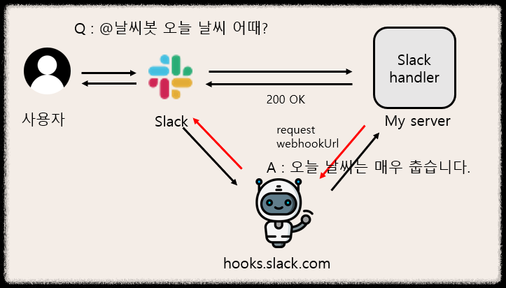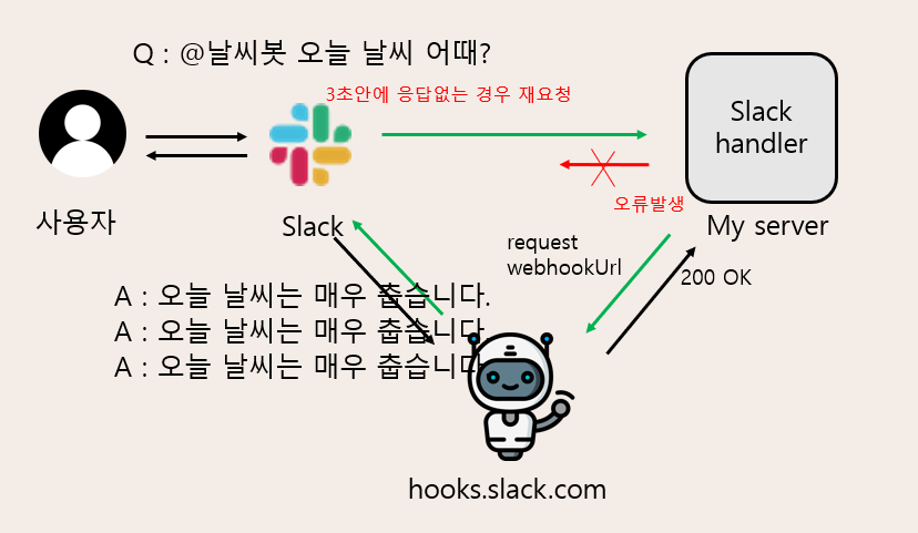 Slack Chatbot 동작원리 먼저 Slack bot을 구성하려면 다음과 같이 동작하도록 만들어야 합니다. 일반적으로 생각했을 때는 서버에서 바로 Response를 보내주는 형태로 생각을 할 텐데 Slack은 봇이 사용자에게 메시지를 전달할 때는 Incoming hooks라는 것을 이용해야 합니다. 그래서 그 hook에 request 형태로 봇의 답변을 전달하여야 합니다. 그런데 여기서 이상한 문제가 발생합니다.