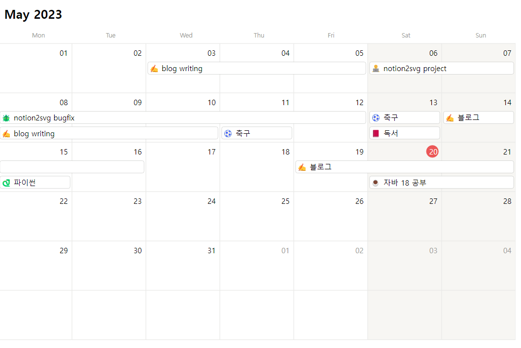 { start_date: "2023-05-06" end_date: "2023-05-07" name: "notion2svg project" icon: icon }이렇게 데이터 모델링을 하고 나니 확실히 좀 더 메모리 절약적이고 유지보수할 때도 훨씬 효율성이 좋았습니다. 그리고 end_date에서 start_date를 뺀 값으로 가로길이를 알 수 있게 되므로 가로로 merge 된 디자인 역시 구현할 수 있게 되었습니다. 또한 페이지의 시작날짜에 디자인을 딱 한 번만 해주면 되는 훨씬 가벼운 로직으로 탄생하게 되었습니다.