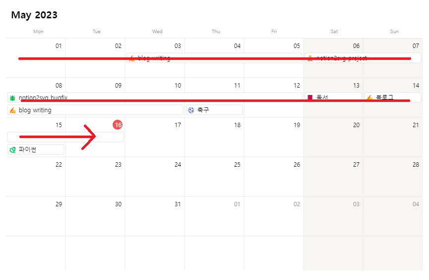 그런데 문제는 그냥 꽂아 넣기만 하면 되는 것이 아닙니다. notion 캘린더를 보면 다음과 같이 notion 페이지의 시작 날짜와 끝 날짜에 따라 가로로 merge 된 디자인을 볼 수 있습니다. 또는 한 날짜에 두 개의 페이지가 공존하는 경우도 있겠죠. 따라서 각 경우에 따라 페이지 블럭이 가지는 x축, y축, width, height값을 각각 계산해야 합니다.