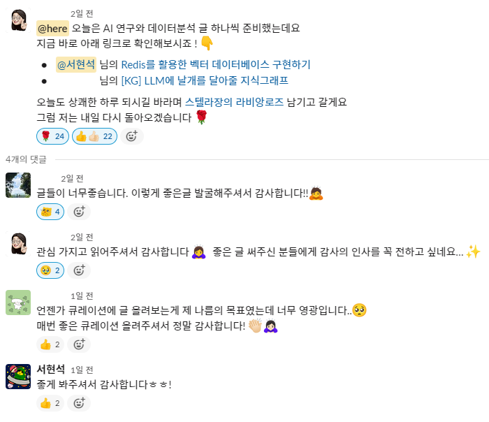 AI 분야에서 일하고 있는 만큼 좋은 인사이트를 공유하고자 AI 연구 채널로 들어왔지만 정작 AI 관련 글을 3개밖에 안 썼다는 점은 반성하게 되는 것 같습니다. (