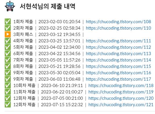 글또에서 2주에 포스팅 한 개씩 필수로 제출해야 하는 목적에 맞춰서 3회 차를 제외하여 총 11개의 글을 작성하였고 추가적으로 2개를 더 제출하여 총 13개 제출을 마감하였습니다.(원래는 14개지만 하나는 옛날 글을 재발행한 거라 제출에서 제외하였습니다.)