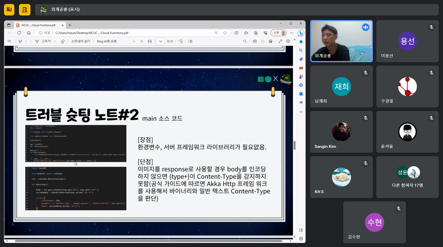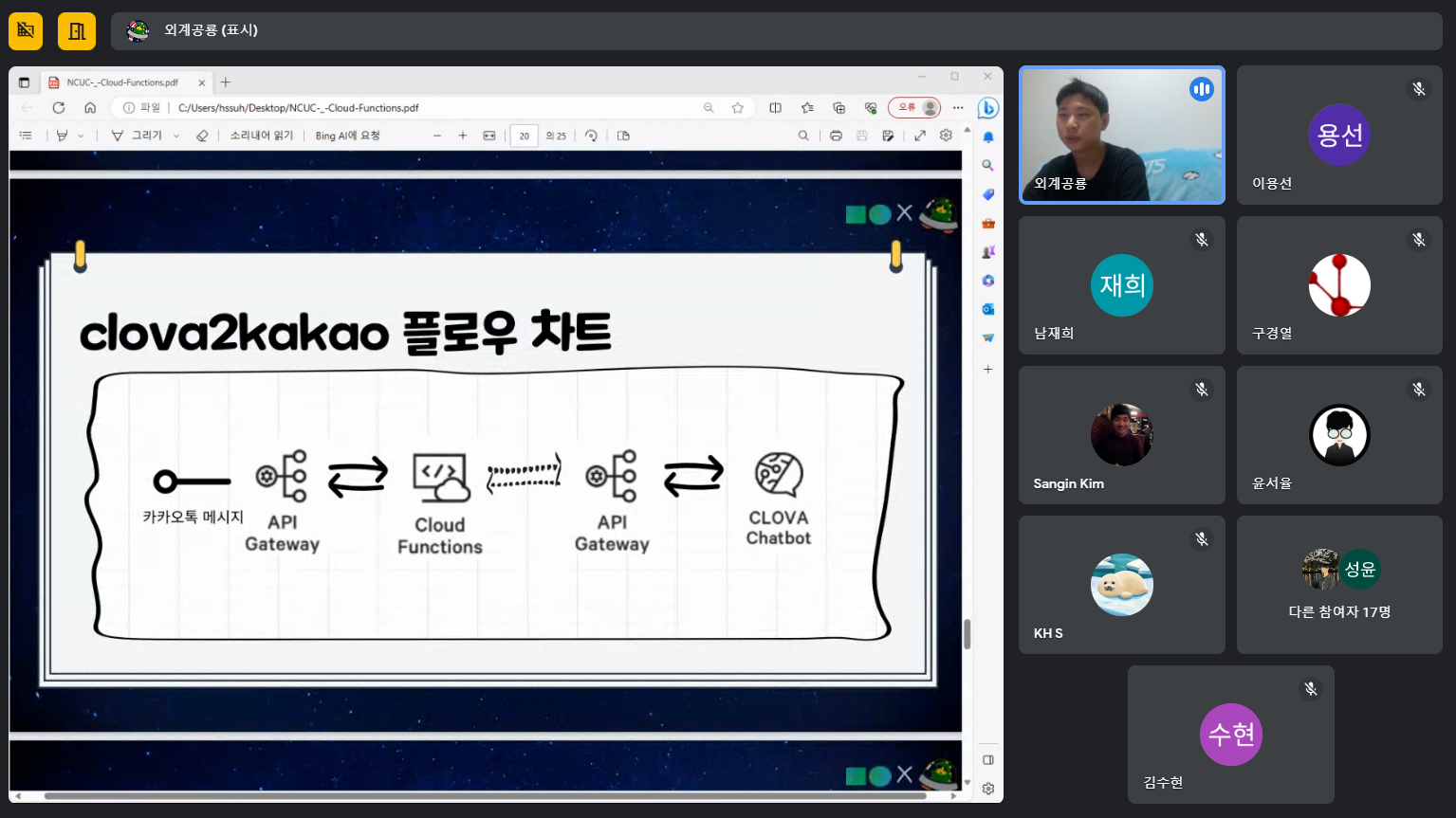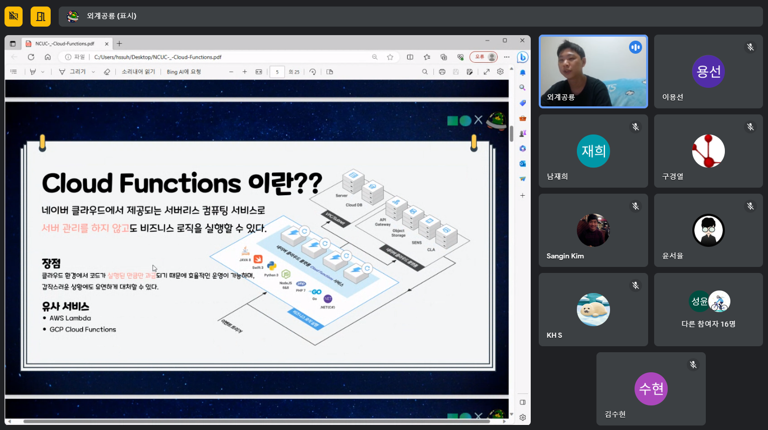 저는 이 행사에서 스피커로 참여했었는데요. 제가 발표한 내용은 “Cloud Functions 컨텐츠 만들기”라는 주제로 발표했었습니다. Cloud Functions는 제가 주니어 마스터로 3개월 동안 활동하면서 주로 사용했었던 네이버 클라우드의 서비스이기도 하고 지금까지 정리했던 내용들을 어딘가에 발산하고 싶다는 작은 소망도 있었기에 이번에 과감하게 스피커로 한번 도전해 보았는데요. 발표가 많이 서툴렀음에도 불구하고 많은 분들의 격려와 응원 속에서 발표를 무사히 마무리 지을 수 있었습니다.