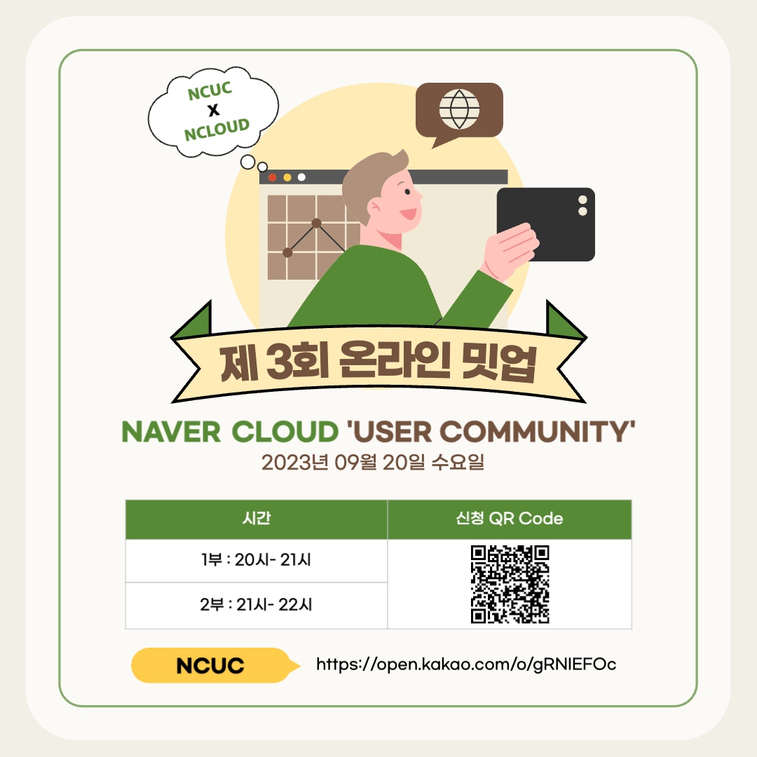 NCUC는 NAVER Cloud User Community의 약자로서 네이버 클라우드 플랫폼을 사용하는 유저들이 모여서 각 종 문의사항, 트러블 슛팅 경험 등을 나누고 이야기하는 모임입니다. ManVSCloud님께서 운영하시는 커뮤니티로서 누구나 참여 가능하고 다양한 필드에서 네이버 클라우드를 사용하고 계신 고수분들과 마스터, 주니어 마스터, 그리고 네이버 클라우드 직원분들도 계시므로 네이버 클라우드 관련 궁금한 사항들이 있다면 NCUC 커뮤니티를 통해 친절하고 손쉽게 답변을 얻으실 수 있습니다.
