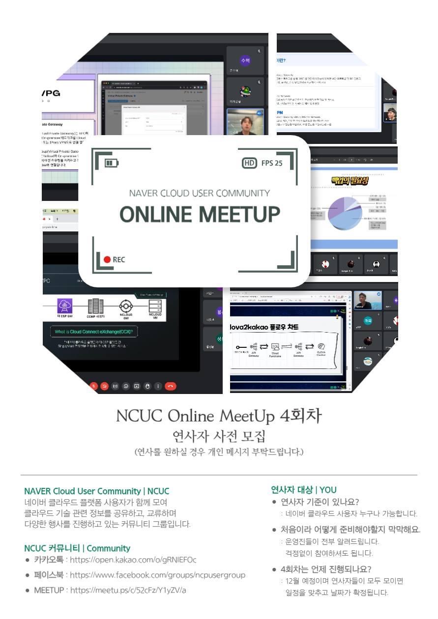 NCUC Online MeetUp 3회차 홍보 포스터 NCUC 온라인 밋업 역시 마찬가지로 NCUC에서 개최되는 테크톡 행사이며, 누구나 참여할 수 있고 스피커로 지원도 할 수 있습니다. NCUC Online MeetUp은 NCUC 커뮤니티장이신 ManVSCloud님께서 직접 운영하는 밋업 행사로서 올해 벌써 3회 차까지 진행되었고 4회 차도 곧 진행될 예정입니다.