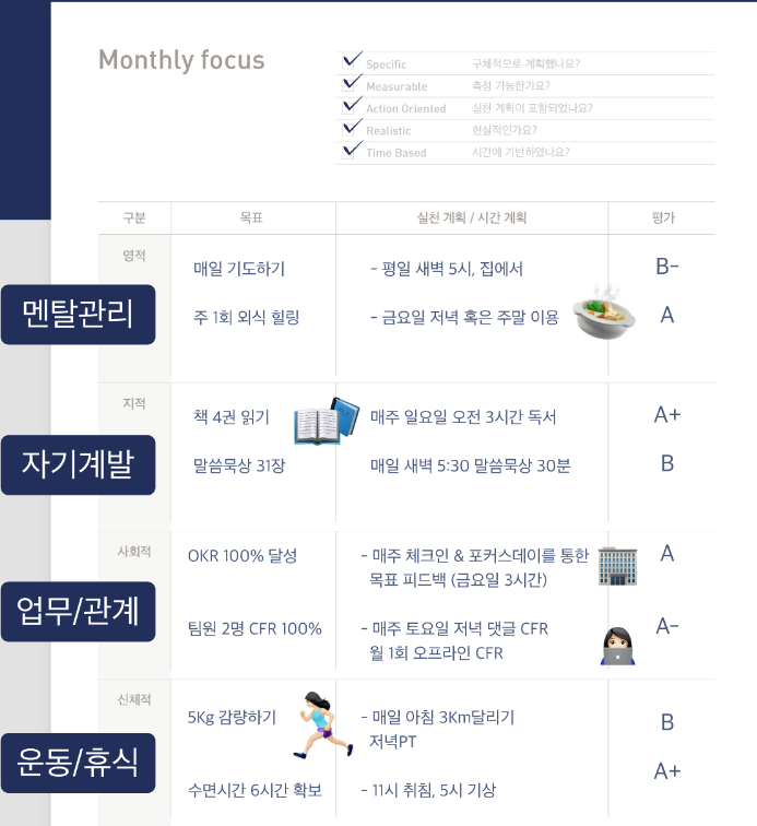 이런식으로 바꾸고 나니 신체적 목표나 사회적 목표 달성을 하지 못해도 크게 스트레스받는 일이 없었고 지적 목표를 달성했을 때 좀 더 뿌듯함을 느끼게 되었고 저는 그 뒤로 가장 이루고 싶었던 월간 목표는 대부분 달성할 수 있었던 것 같습니다.