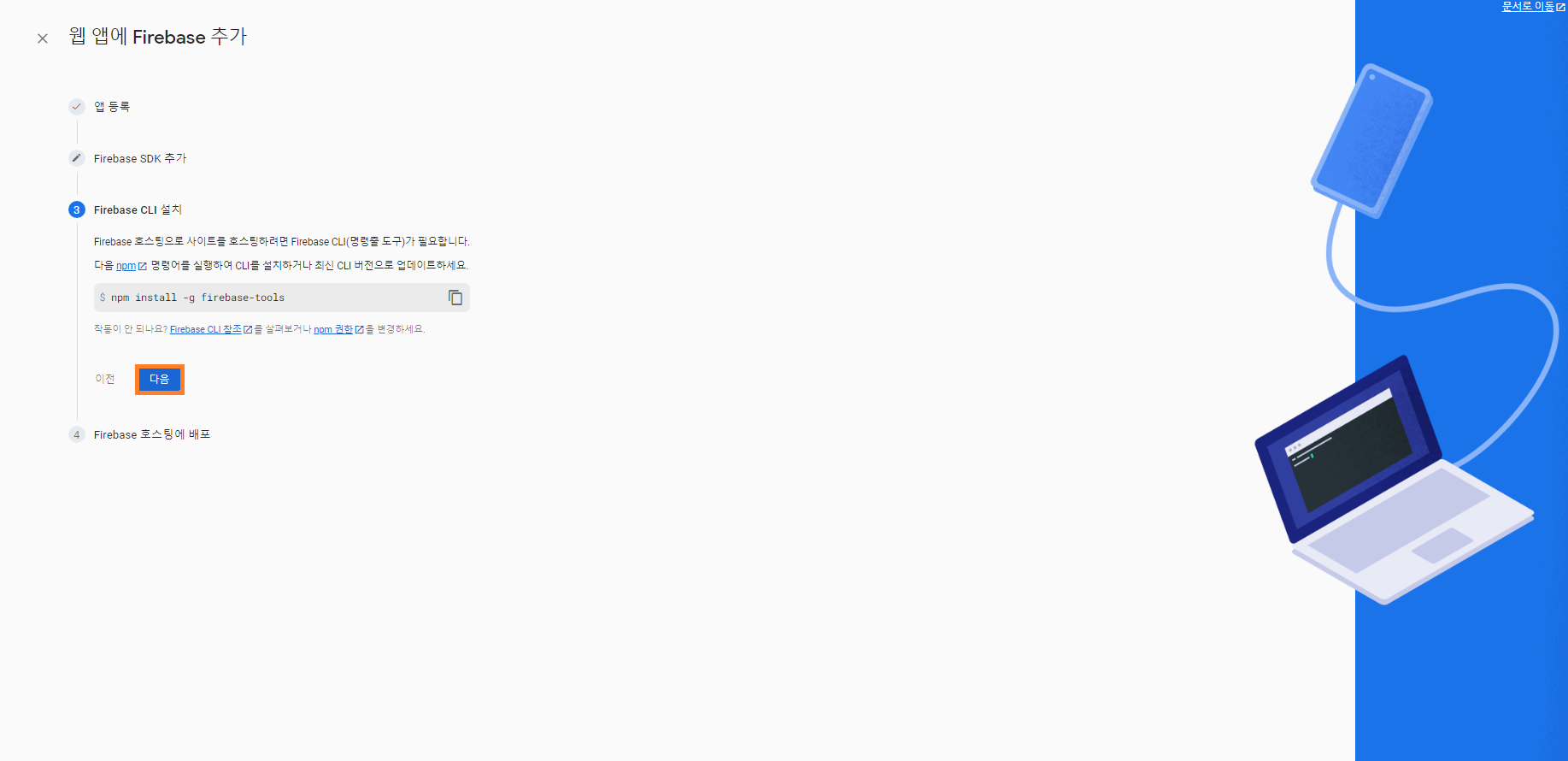 Firebase 앱 정보 입력하기 앱 등록 버튼을 클릭하면 생성되는데 조금 시간이 걸리고 나서 다음과 같은 화면이 나타납니다. 이때부터는 계속해서 다음 버튼을 클릭하시면 됩니다.