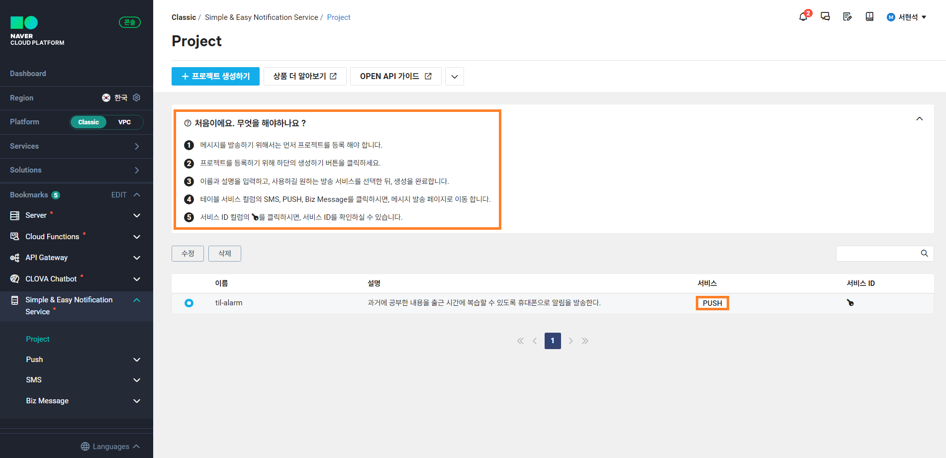SENS 프로젝트 생성하기 SENS(Simple & Easy Notification Service)의 장점 중 하나는 프로젝트 목록 위로 어떤 순서로 진행해야 되는지에 대한 가이드가 친절히 나와있어서 그대로 따라 하시면 됩니다. 가이드를 읽어보시면 3번까지 진행되었음을 확인하실 수 있습니다. 그대로 4번 순서를 진행하기 위해 [PUSH] 버튼을 클릭합니다.