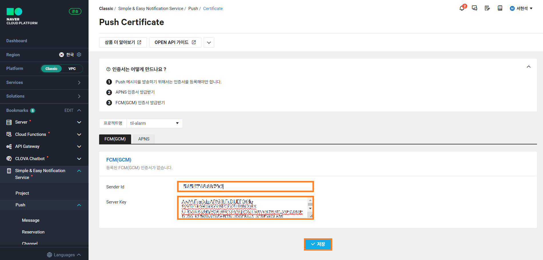 FCM을 선택해서 Firebase에서 발급받은 발신자 ID와 서버키로 인증서를 등록하자. FCM을 이용하려면 Sender Id와 Server Key를 등록하여야 하는데 이 정보들은 이전에 Firebase에서 발급받은 발신자 ID와 서버키를 넣어주시면 됩니다. 복사할 때 공백이나 개행을 주의해 주시고 복사를 마쳤다면 [저장] 버튼을 클릭해 주시면 네이버클라우드 플랫폼에서의 설정은 전부 마치게 됩니다.