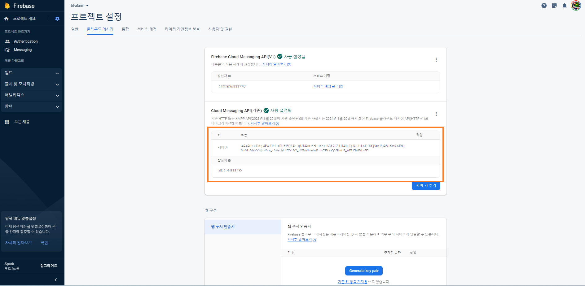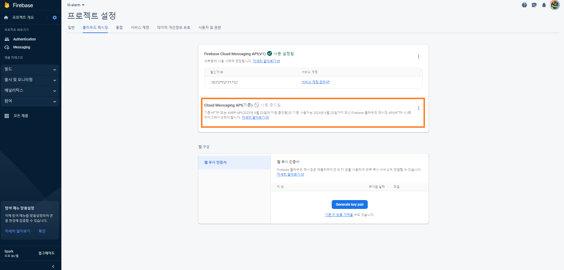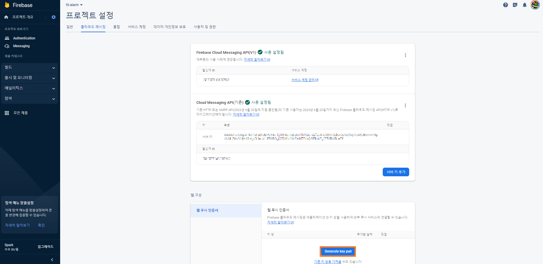 추가로 토큰을 구할 때 필요한 vapidKey의 경우에는 다음과 같이 Firebase에서 인증키를 받아서 등록하시면 됩니다. Firebase 프로젝트 설정 페이지에서 [Generate key pair] 버튼을 클릭 후 생성되는 키 쌍을 복사해서 사용하시면 됩니다.