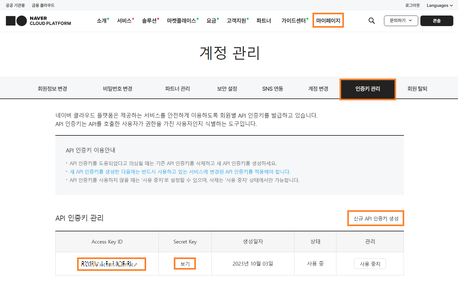 x-ncp-iam-access-key값은 네이버클라우드의 마이페이지로 이동해서 인증키를 얻으실 수 있습니다.