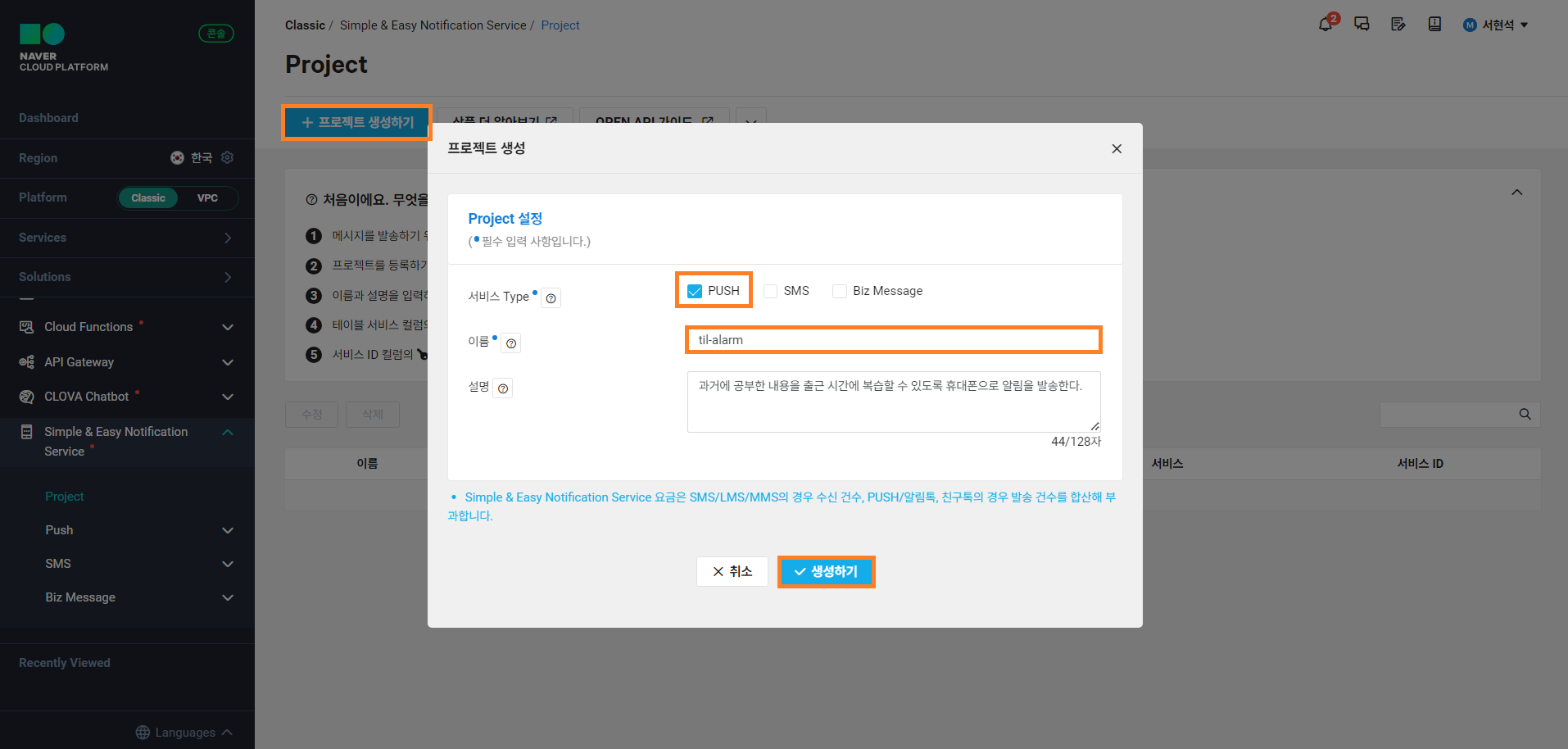 Ncloud의 SENS(Simple & Easy Notification Service) 서비스 Simple & Easy Notification Service를 찾아서 들어오셨다면 화면 상단에 [+프로젝트 생성하기] 버튼이 있는 것을 확인하실 수 있습니다. 해당 버튼을 클릭하여 프로젝트 생성에 필요한 설정들을 입력합니다. 저희는 PUSH 기능을 사용할 것이기 때문에 서비스 Type을 PUSH로 체크해 주시고 프로젝트 이름을 적어주신 다음 [생성하기] 버튼을 클릭해 주시기 바랍니다.