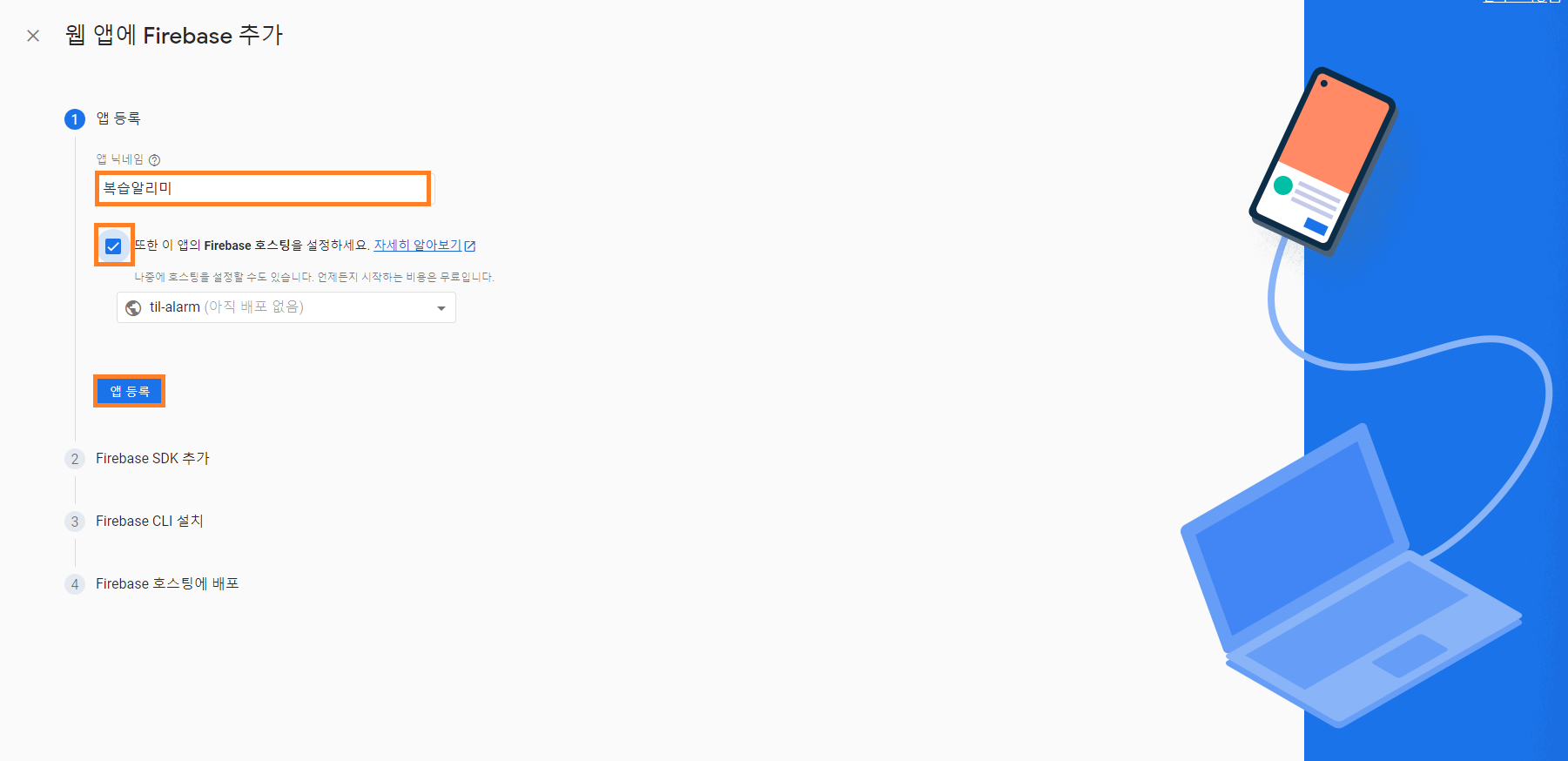 Firebase 웹 앱 등록하기 웹 앱 아이콘을 클릭하고 나면 다음과 같이 앱을 설정하는 단계가 나타나는데 여기서도 마찬가지로 순차적으로 진행해 주시면 됩니다. 앱 닉네임을 지정해 주시고 호스팅에 체크한 다음 앱 등록 버튼을 클릭해 줍니다.