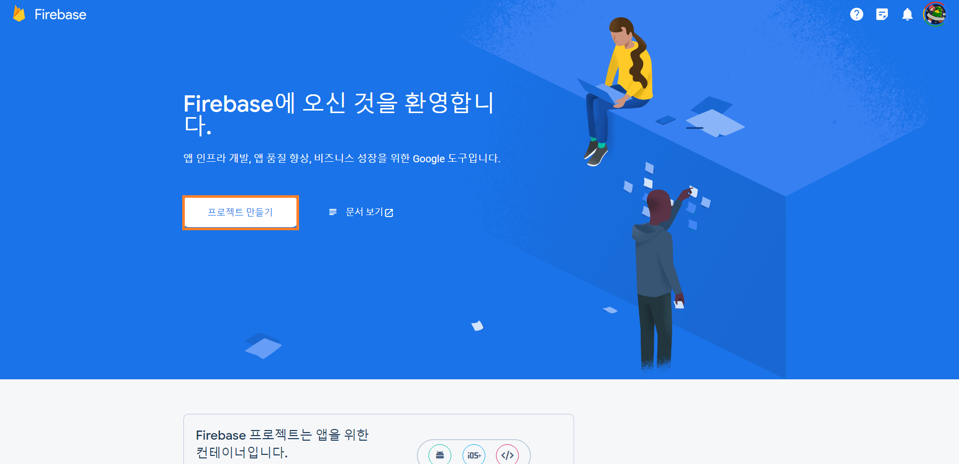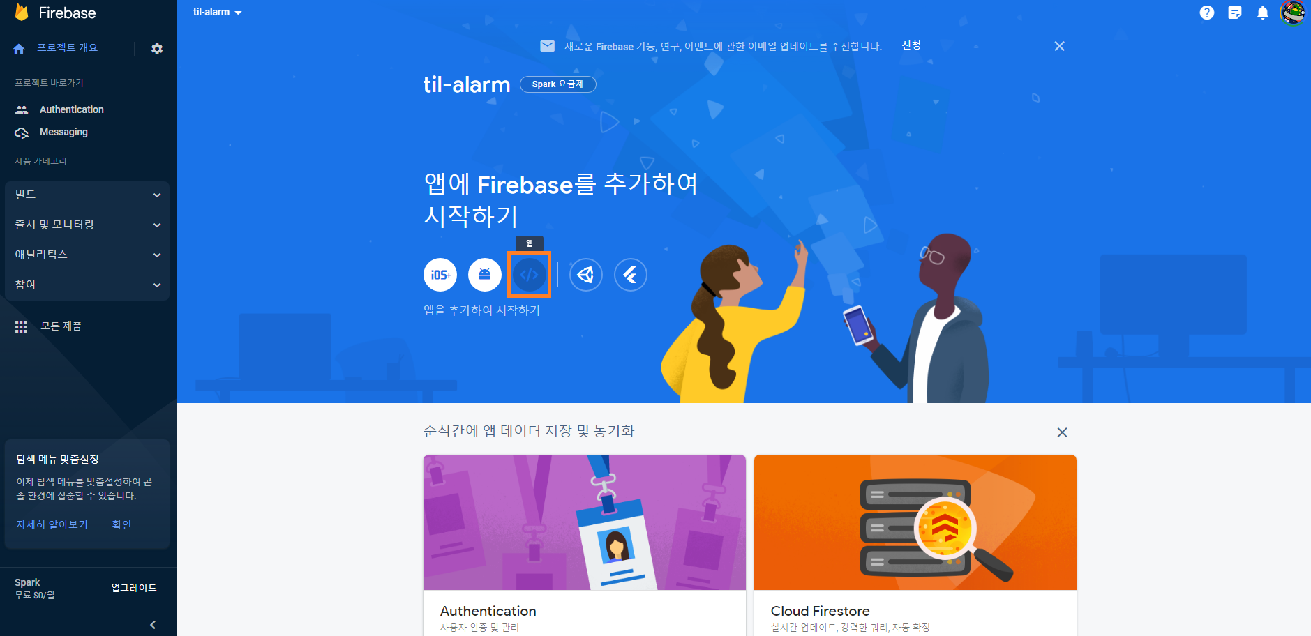 Firebase 프로젝트 만들기 3단계 진행 여기까지 완료하시면 1~2분 정도 대기 후 프로젝트가 생성되신것을 확인하실 수 있게 됩니다. 프로젝트를 생성하면 다음과 같은 화면이 나타나는데 여기서 [웹 아이콘]을 클릭해서 웹 앱을 Firebase에 등록해보도록 하겠습니다.