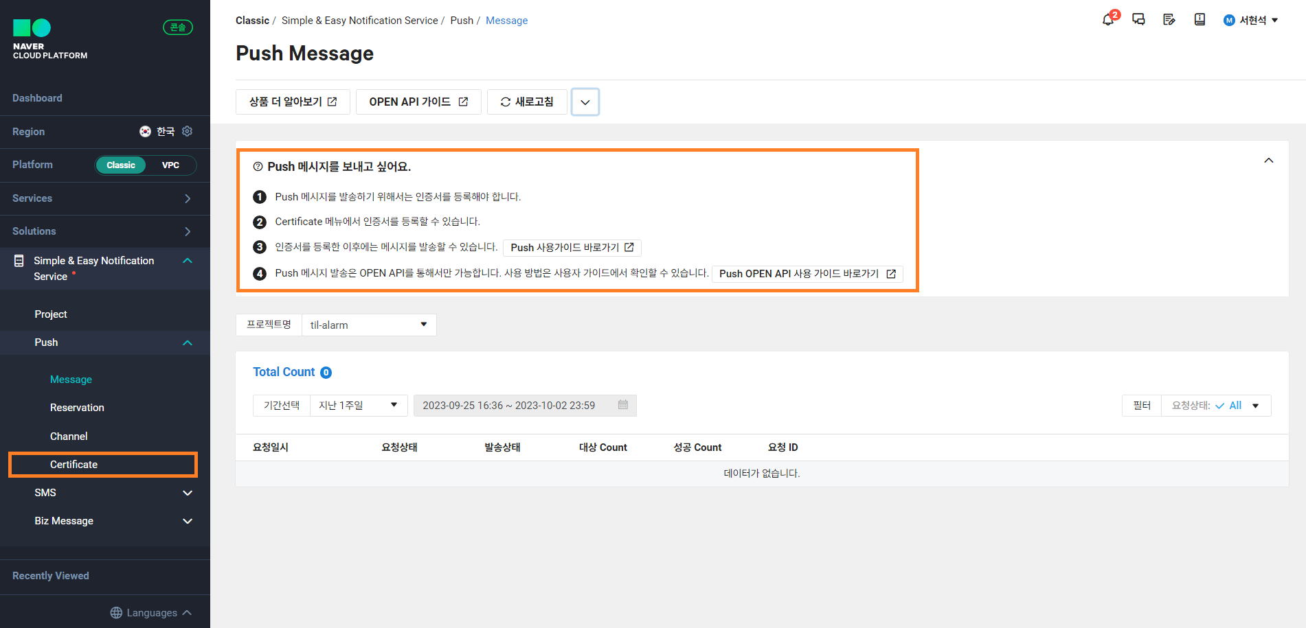 SENS 프로젝트 페이지(가이드가 상단에 표시되어있어서 편리하다) Push 메뉴로 이동하고 나서도 마찬가지로 상단에 진행 순서에 대한 가이드가 표시되어 있어서 편리합니다. 마찬가지로 순서대로 진행해 주시면 됩니다. 여기서는 인증서를 등록하기 위해 [Certificate] 메뉴로 이동하라고 가이드되어있으므로 왼쪽 내비게이션바를 통해 [Certificate] 메뉴로 이동하도록 하겠습니다.