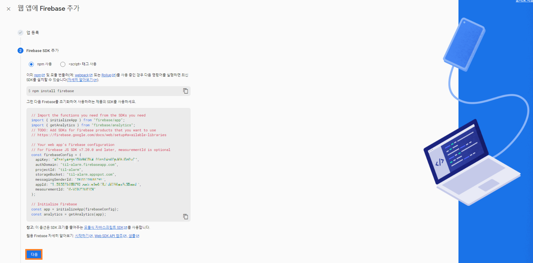 import { getMessaging, getToken } from "firebase/messaging"; import { initializeApp } from "firebase/app"; import { registerDeviceToken } from "./api/ncloud-api"; const firebaseConfig = { apiKey: process.env.REACT_APP_API_KEY, authDomain: "til-alarm.firebaseapp.com", projectId: "til-alarm", storageBucket: "til-alarm.appspot.com", messagingSenderId: process.env.REACT_APP_MESSAGING_SENDER_ID, appId: process.env.REACT_APP_APP_ID, measurementId: process.env.REACT_APP_MEASUREMENT_ID, }; const app = initializeApp(firebaseConfig); const messaging = getMessaging(app); export default async function setupAlarm() { const permission = await Notification.requestPermission(); if (permission === "denied") { console.log("알림 권한 허용 안됨"); return; } const token = await getToken(messaging, { vapidKey: process.env.REACT_APP_VAPID_KEY, }); registerDeviceToken(process.env.REACT_APP_USER_ID, token); // 네이버클라우드 SENS API 호출 };위 코드는 Firebase에서 프로젝트 등록할 때 제공된 SDK를 이용해서 만든 코드입니다. (위에서 Firebase 프로젝트 만들기 3단계 진행 이미지 참고) 따라서 Firebase 프로젝트 설정페이지에 접속하여도 SDK 코드를 확인할 수 있는데 참고하시면 좋을 것 같습니다.