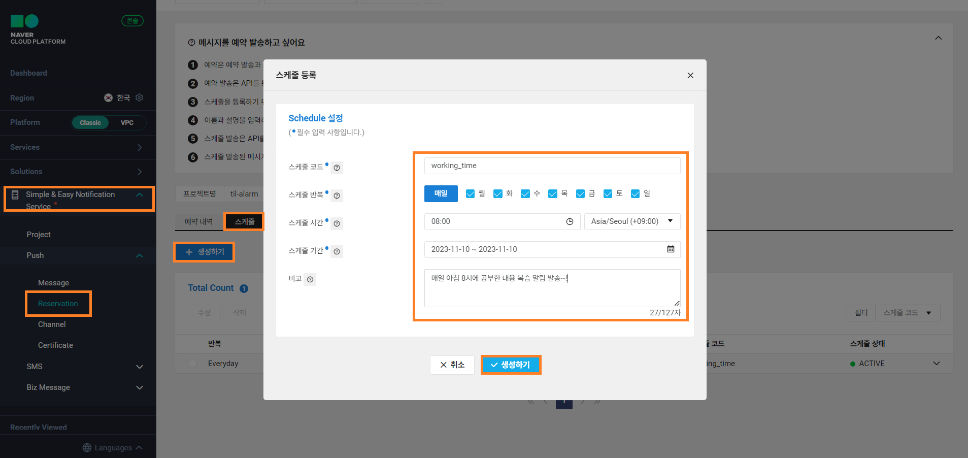 { "target": { "type": "ALL" }, "message": { "default": { "content": "복습할 내용이 도착하였습니다. 오늘도 파이팅 하세요~!😊" } }, "scheduleCode": "working_time" }이렇게 발송을 하는 경우 PUSH 알람이 바로 오지 않고 스케줄 등록이 되어 네이버클라우드 콘솔에서 설정한 시간에 맞춰 발송이 됩니다. 네이버클라우드 콘솔에서 스케줄 등록하는 방법은 다음과 같습니다.