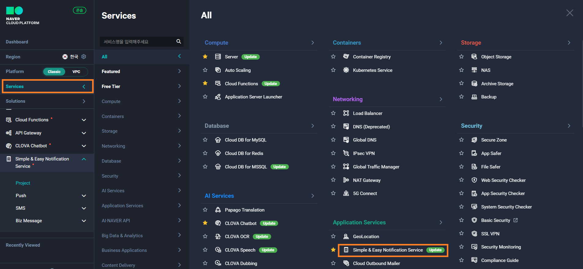 SENS 서비스를 이용하려면 다음과 같이 네이버클라우드 플랫폼 콘솔에 접속하여 왼쪽의 내비게이션바에서 [Services] 메뉴를 클릭하여 [Simple & Easy Notification Service]를 선택합니다.