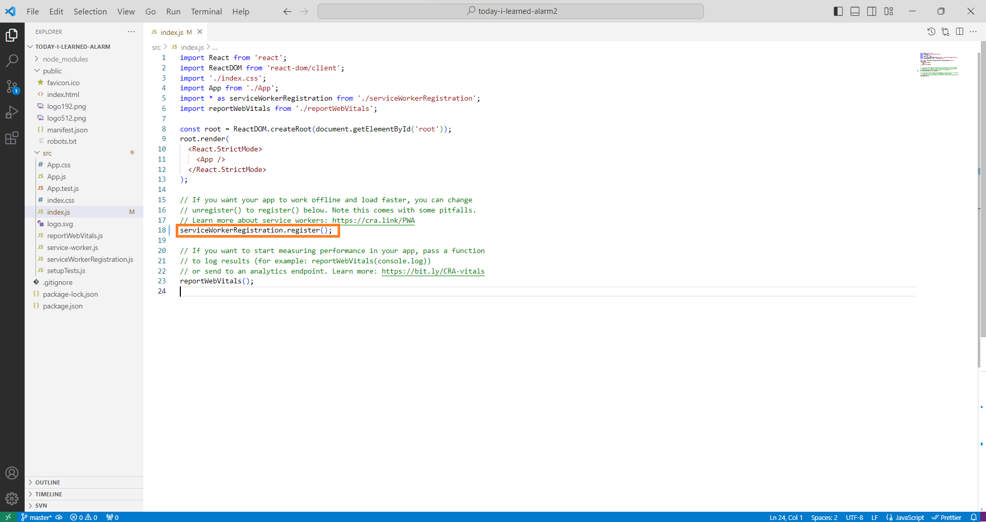 먼저 프로젝트를 전부 다운로드하시면 다음과 같은 프로젝트를 확인하실 수 있습니다. 이때 src 폴더 밑에 index.js 파일에서 추후에 백그라운드 환경에서도 서비스가 돌아갈 수 있도록 서비스 워커 등록을 해주기 위해 serviceWorkerRegistration.unregister()를 serviceWorkerRegistration.register()로 변경합니다.