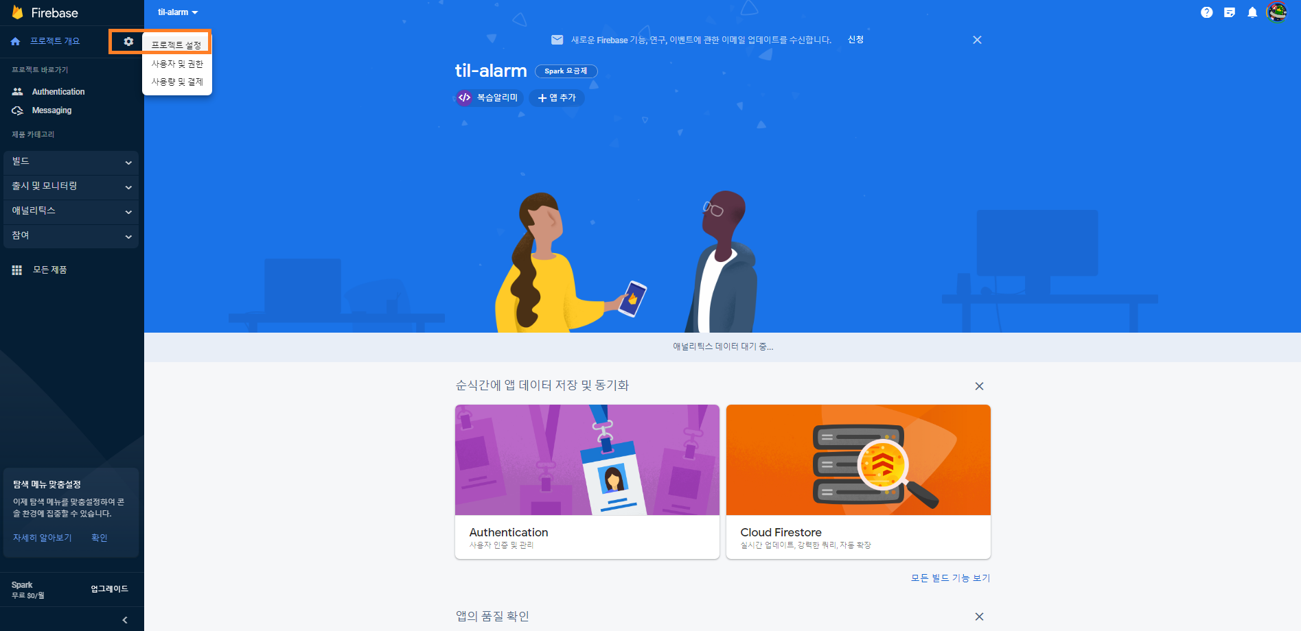 Firebase 앱 등록하기 프로젝트를 생성하고 나면 콘솔로 이동되는데 콘솔에서 왼쪽 메뉴바의 [톱니마퀴 아이콘] > [프로젝트 설정]을 클릭하여 설정 페이지로 이동합니다.