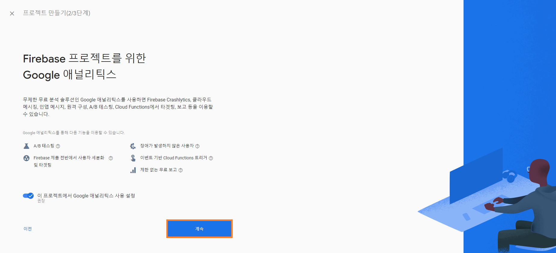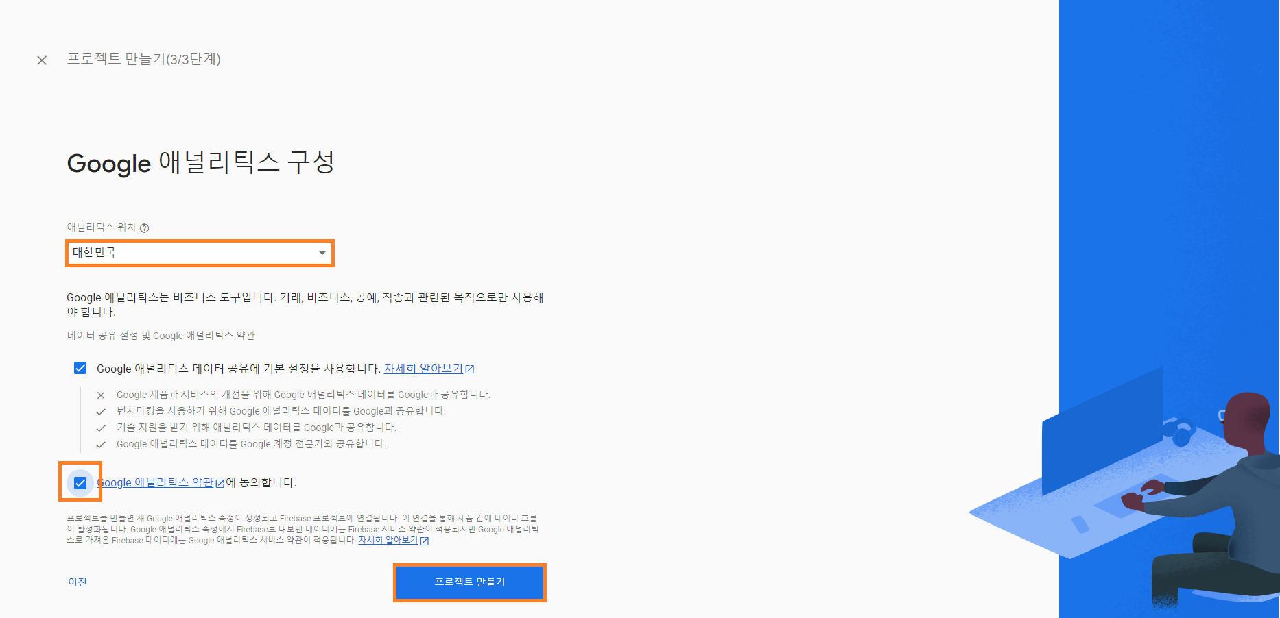 Firebase 프로젝트 만들기 그리고 다음과 같이 프로젝트 만들기 3단계를 진행해주시면 됩니다. 프로젝트 이름을 등록하고 약관 등을 체크해주시고 나면 프로젝트를 생성할 수 있습니다.