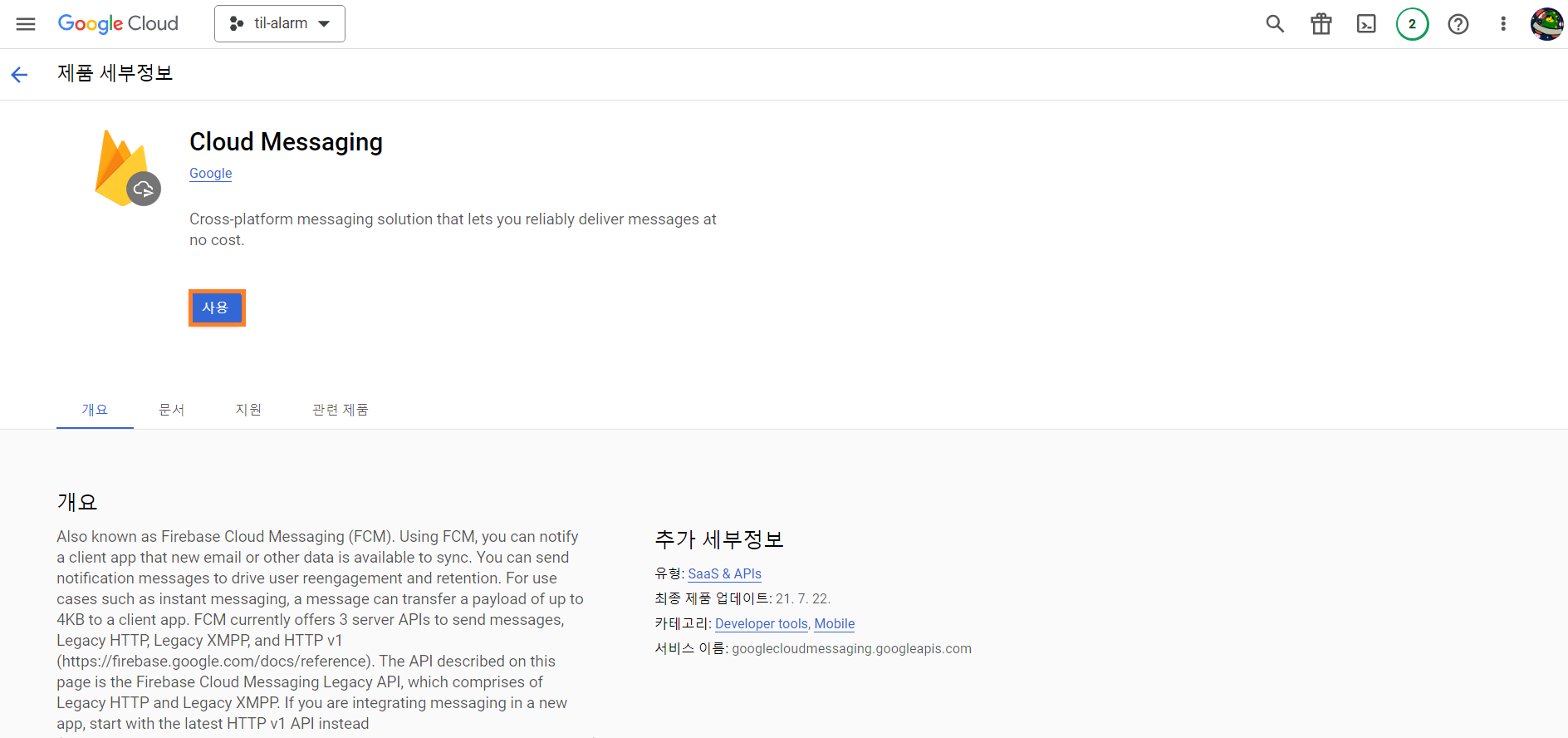 Firebase 기존 Cloud Messaging API 사용하기 그러면 다음과 같이 Cloud Messaging 제품 페이지로 이동되는데 이곳에서 [사용] 버튼을 클릭합니다. 그러면 30초가량의 로딩이 진행된 뒤에 해당 제품이 사용 중으로 변경이 되는데 그 뒤에 다시 Firebase 프로젝트 설정 화면으로 돌아오면 다음과 같이 서버 키가 생성되어 있는 것을 확인하실 수 있습니다.