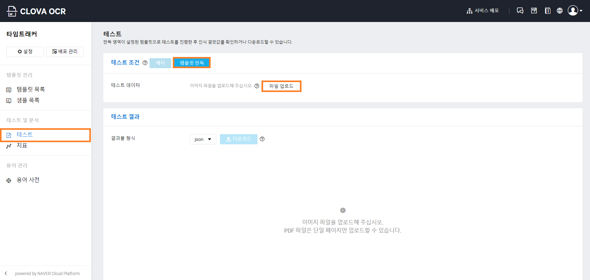 다시 템플릿 목록으로 돌아와서 왼쪽 내비게이션바에서 [테스트] 메뉴를 클릭하여 테스트 조건을 [템플릿 판독]으로 변경 후 [파일 업로드] 버튼을 클릭하여 조금 전에 템플릿으로 등록해 놓았던 이미지를 업로드해보도록 하겠습니다. (베타는 배포 후 사용가능합니다.)