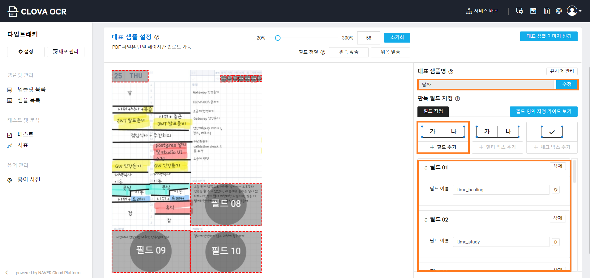 CLOVA OCR 판독 필드 지정하기 타임트래커 이미지를 올려놓고 나면 다음과 같이 오른쪽에서 판독 필드를 지정할 수 있게 됩니다. [+ 필드 추가] 컴포넌트를 클릭하면 왼쪽 화면에서 영역을 지정할 수 있게 되는데 추출하고 싶은 영역을 선택해서 오른쪽에 필드 이름을 기입할 수 있게 됩니다.