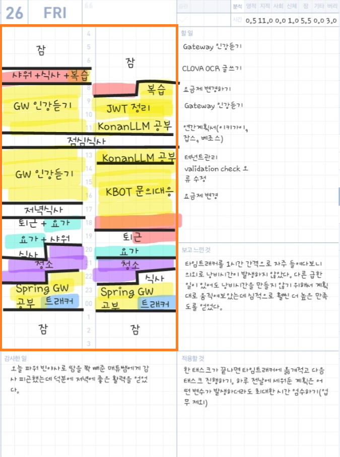 다음으로는 태블릿용 PDF로 작성된 디지털 타임트래커가 아닌 작년에 실제로 수기로 작성한 필기용 타임트래커를 카메라로 촬영 후 업로드 해보았습니다.