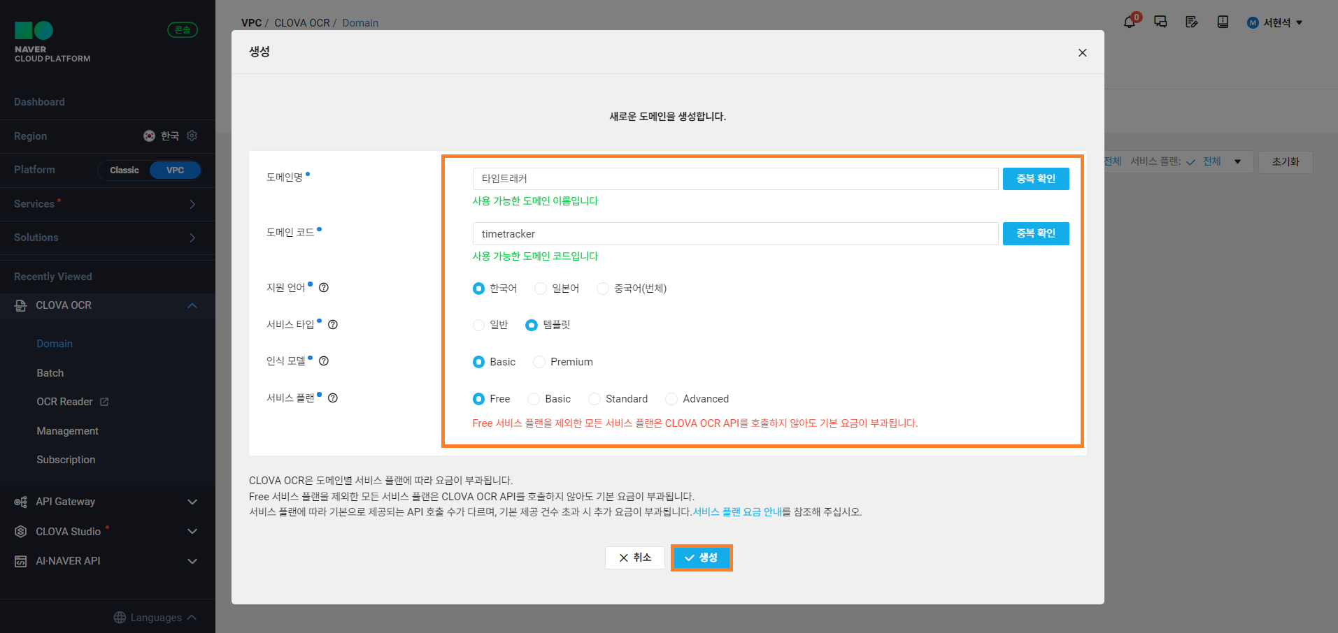 추가로 인식 모델은 Basic 모델에 서비스 플랜을 Free를 선택하였습니다. Basic 모델은 Premium 모델에 비해 인식률은 조금 떨어질 수 있을지라도 무료로 사용할 수 있는 Free 플랜을 선택할 수 있다는 장점이 있습니다. 상세한 요금은 네이버클라우드 플랫폼 CLOVA OCR 가이드에서 확인하시길 바랍니다.