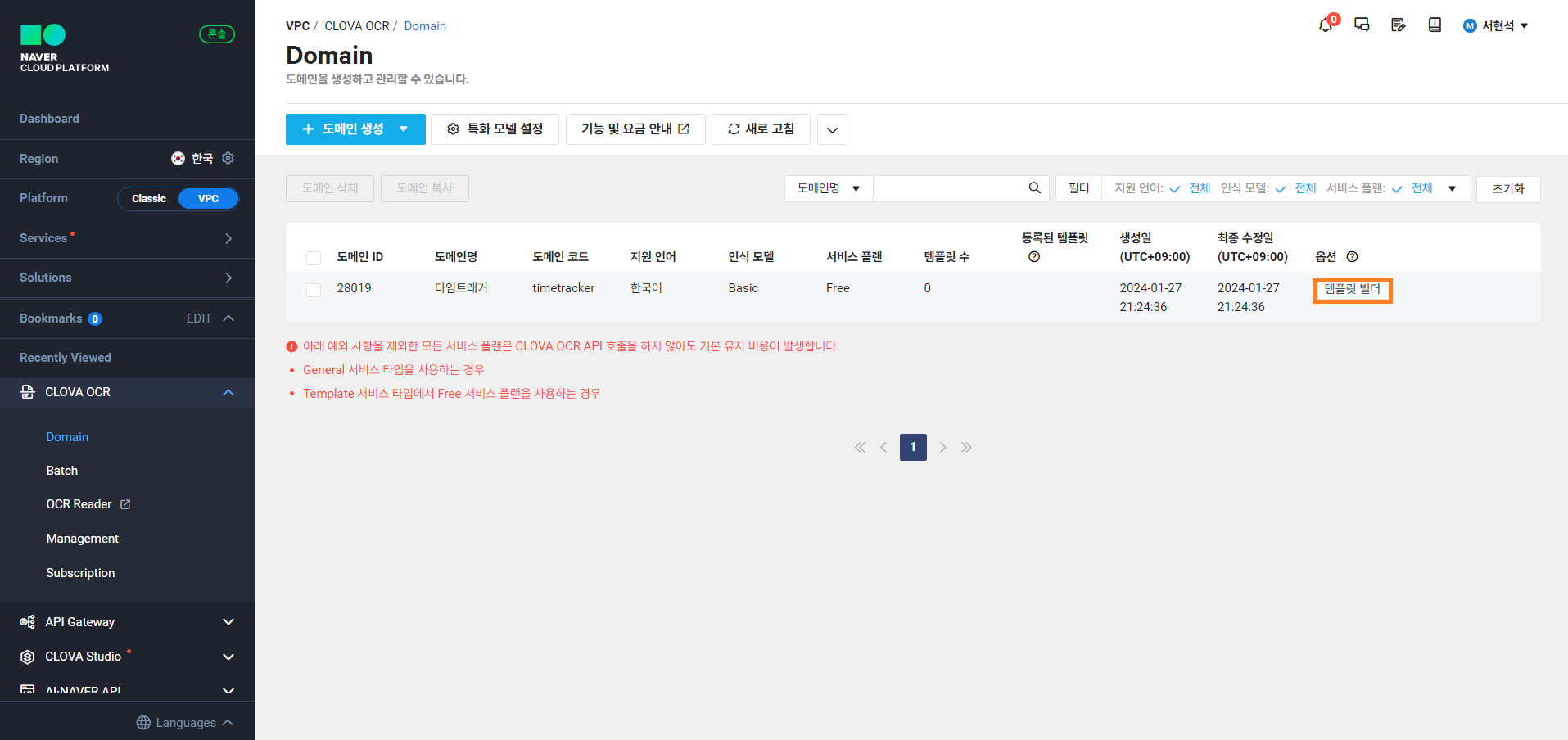 CLOVA OCR 도메인 생성하기 서비스 타입을 일반으로 선택하는 경우 OCR 사용시 이미지 내 텍스트와 표를 그대로 추출할 수 있습니다. 반대로 템플릿 도메인을 선택하는 경우 판독 영역을 직접 지정하는 템플릿 빌더를 사용할 수 있습니다. 저는 타임트래커가 갖고 있는 노트의 형식을 이용해 직접 영역을 지정할 예정이므로 템플릿 타입을 선택하였습니다.