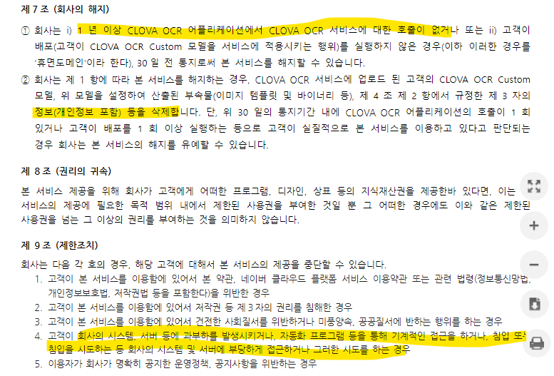 CLOVA OCR을 사용하려면 먼저 서비스 이용약관을 읽고 동의를 해주셔야 하는데요. 여기서 주의 깊게 보시면 좋을 점은 7조와 9조 입니다. 먼저 7조에 해당하는 항목들을 살펴보면 1년 이상 사용하지 않을 경우 데이터가 삭제될 수 있다고 주의하고 있습니다. 이점을 점을 꼭 기억해 두시고 추후에 OCR을 사용하지 않으신다면 데이터를 미리 백업해 두시는 것을 권장드립니다.