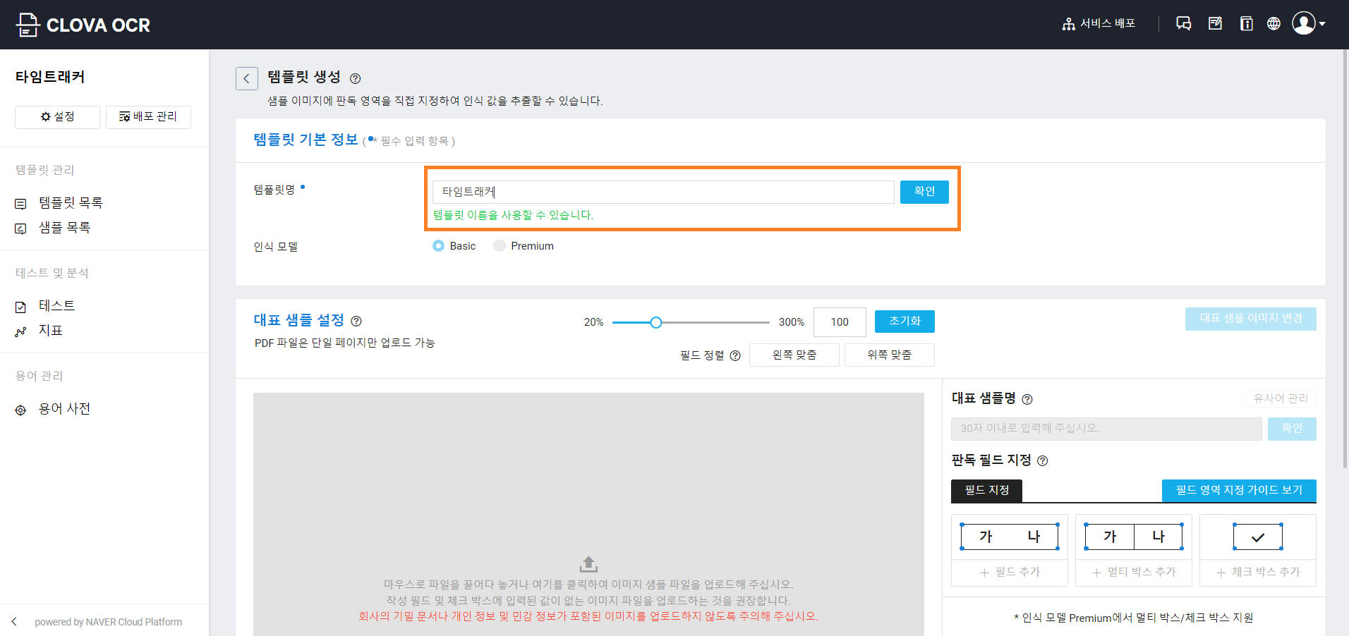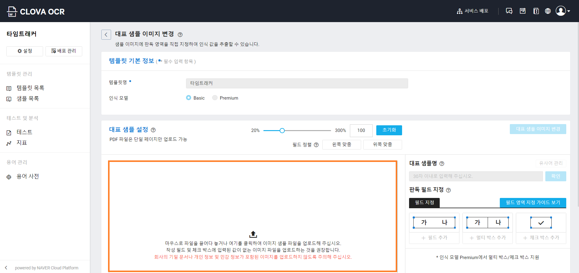 CLOVA OCR 템플릿 기본 정보 등록하기 템플릿 기본 설정까지 완료하고 나면 다음과 같이 대표 샘플을 등록할 수 있게 됩니다.