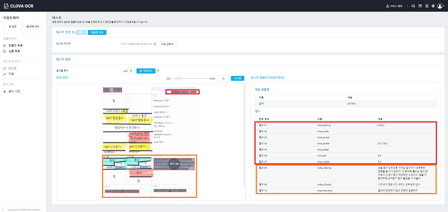 CLOVA OCR 대표 샘플 설정하기 저는 이곳에 제가 작성해 놓은 타임트래커 이미지를 업로드해보도록 하겠습니다.
