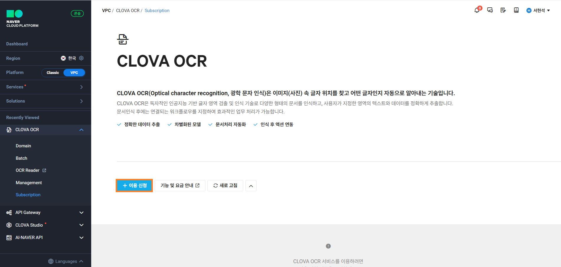 먼저 CLOVA OCR을 사용하기 위해서 네이버클라우드 플랫폼의 콘솔로 접속합니다.