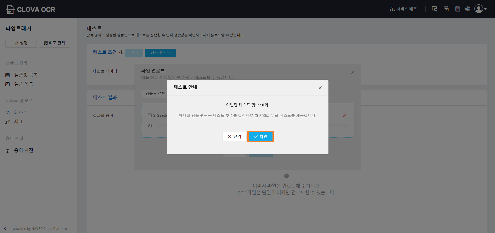 CLOVA OCR 테스트 해보기 파일 업로드 팝업이 나타나면 준비해 둔 이미지를 업로드하고 확인 버튼을 클릭하여 테스트를 진행합니다. 앞서 Basic 모델에 Free 플랜을 선택했기 때문에 월 300회까지 무료 테스트가 가능하므로 부담없이 편하게 테스트해보실 수 있습니다.