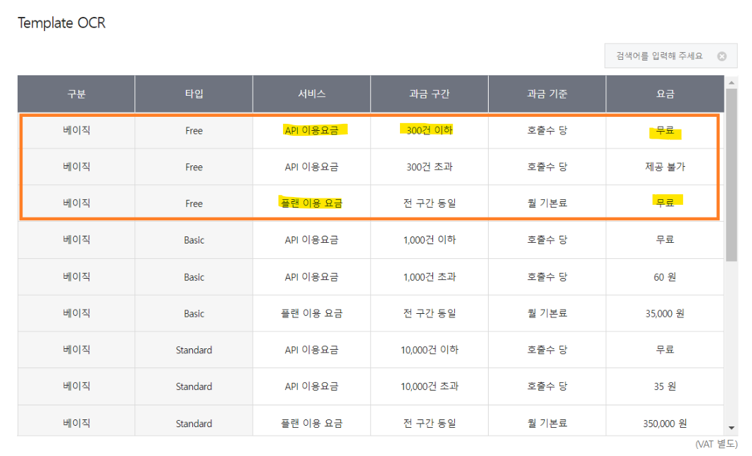 CLOVA OCR 서비스 사용시 가장 저렴하게 사용할 수 있는 베이직 모델 & Free 플랜 요금표