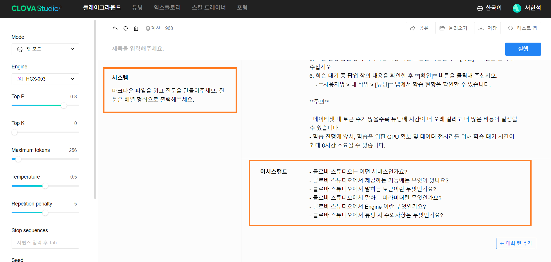 # 클로바 스튜디오 HyperCLOVA 언어 모델을 활용하여 사용자가 입력한 내용에 따라 AI 기술을 통해 생성된 문구를 출력하는 네이버 클라우드 플랫폼의 서비스 # 제공되는 기능 - 문장 생성 - 요약 - 분류 - 대화 - 문장 변환(입력한 예제와 유사한 스타일의 문장으로 문장 형태 변환 가능) - AI Filter(민감, 안전하지 않은 결과물 생성 알림) # 용어 정리 - 프롬프트 : 작업을 수행하기 위해 입력해야할 내용 - 결괏값 : 프롬프트를 기반으로 생성되는 결괏값 (HyperCLOVA 언어 모델은 확률 기반으로 작동하기 때문에 같은 프롬프트을 입력하더라도 다른 결괏값이 생성될 수 있음) - 토큰 : 자연어 처리를 위해 하나의 단어를 세분화한 단어 조각(맛있어 => 맛, 있어) - 파라미터 : 플레이그라운드의 설정 값 - Engine : CLOVA Studio에서 사용하는 언어 모델(LK, HCX..) - Top K : 확률 값이 가장 높은 K개 중 랜덤으로 하나(왠만하면 0으로 설정 권장) - Top P : 토큰 제거시 사용하는 기준 값. 0.8 인 경우, 상위 80%에 포함된 토큰만 후보로 선택 - Maximum tokens : 결괏값을 생성할 때 사용할 최대 토큰 수 (토큰 수를 높게 설정할 수록 긴 결괏값을 출력. 일반 모드 : 최대 2048토큰 / HyperCLOVA X : 최대 4096 토큰 ) - Temperature : 문장의 다양성을 조절하는 값(낮게 설정하면 정형적인 결괏값, 높게 설정하면 다양해짐) - Repetition penalty : 반복적인 결괏값을 생성하지 않도록 반복되는 토큰에는 감점 요소를 부여하는 값 # 튜닝 ### 튜닝 순서 1. 아이디어에 맞는 작업 고르기 2. 작업생성 3. 데이터셋 준비 ### 튜닝 작업 생성하기 1. 작업 선택 2. 모델 엔진 선택 3. 작업 이름 입력 4. 데이터셋 업로드 5. 토큰 산정 팝업 창이 나타나면 예상 사용 토큰을 확인한 후 **[학습]** 버튼을 클릭해 주십시오. 6. 학습 대기 중 팝업 창의 내용을 확인한 후 **[확인]** 버튼을 클릭해 주십시오. - **사용자명 > 내 작업 > [튜닝]** 탭에서 학습 현황을 확인할 수 있습니다. **주의** - 데이터셋 내 토큰 수가 많을수록 튜닝에 시간이 더 오래 걸리고 더 많은 비용이 발생할 수 있습니다. - 학습 진행에 앞서, 학습을 위한 GPU 확보 및 데이터 전처리를 위해 학습 대기 시간이 최대 6시간 소요될 수 있습니다.이 파일내용을 CLOVA X 대화내용에 그대로 복사 붙여 넣고 하단에 위 마크다운 파일을 읽고 질문을 만들어주세요.라는 추가 프롬프트를 입력해서 전달하도록 하겠습니다. 과연 결과가 어떻게 나왔을까요?
