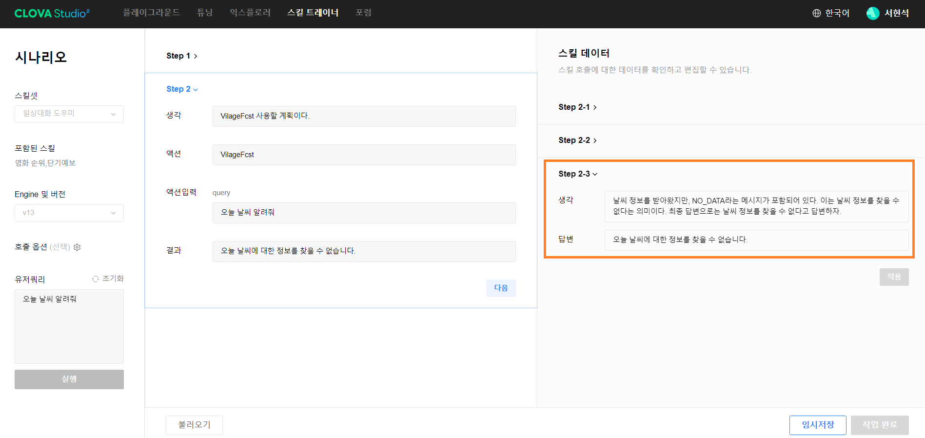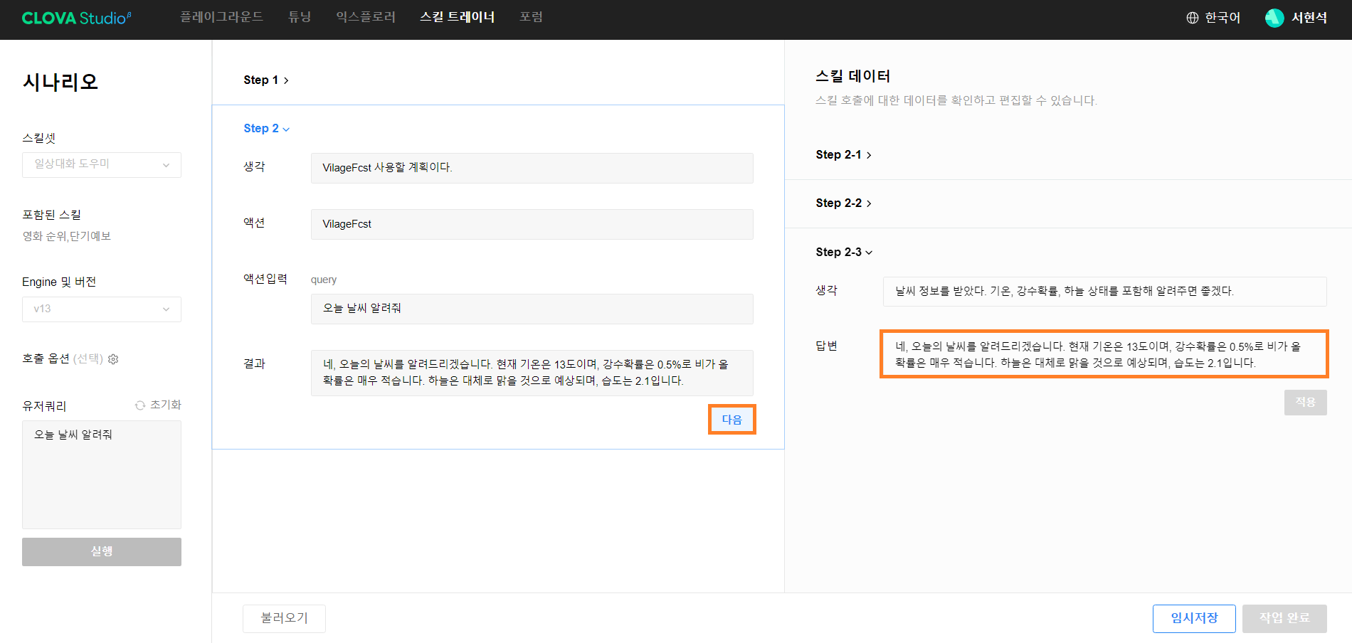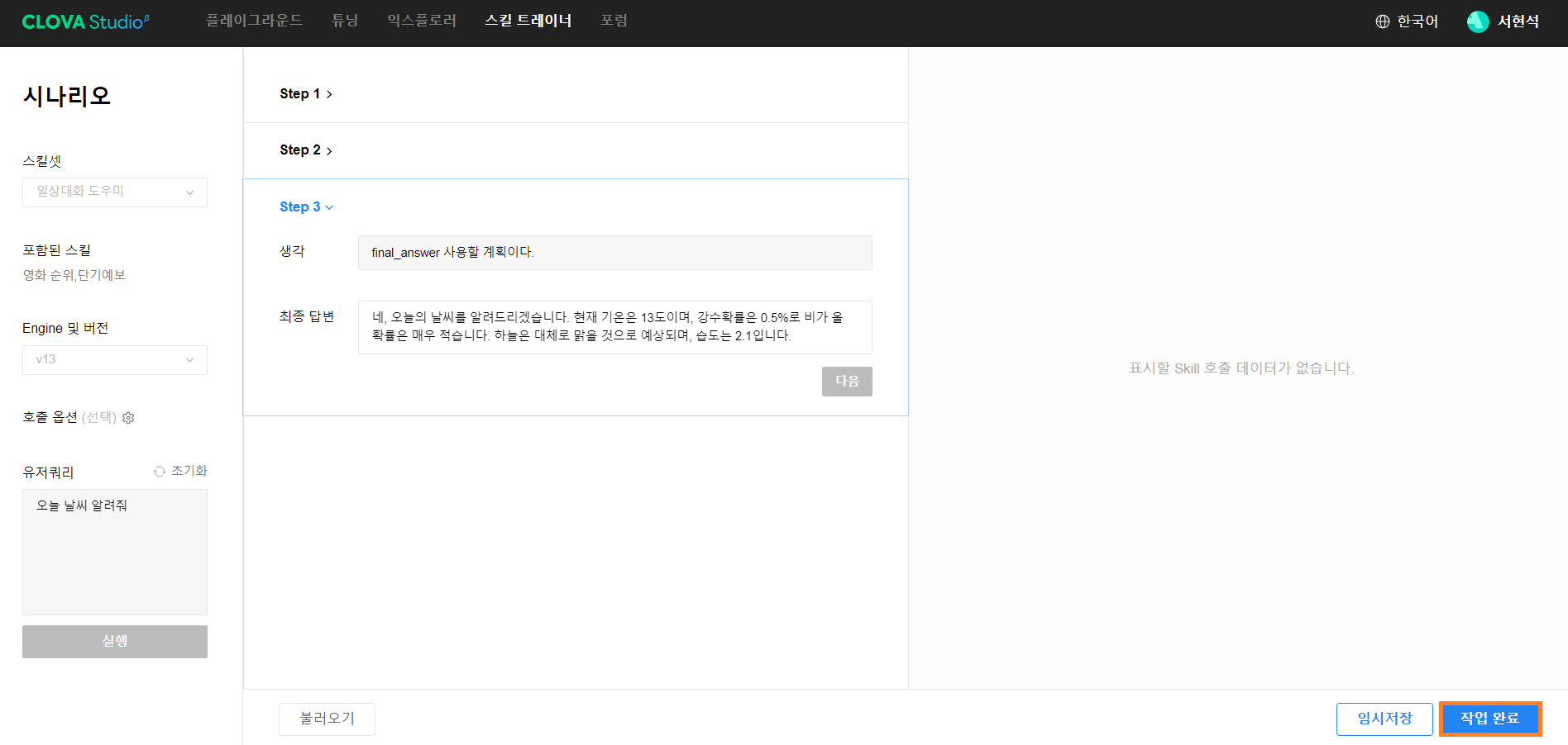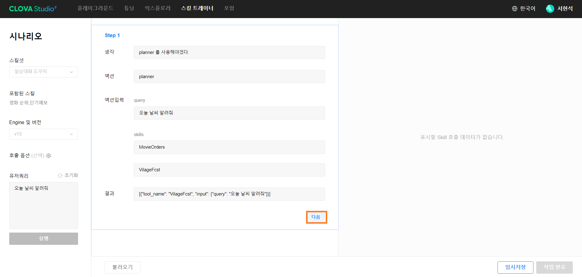 CLOVA Studio 시나리오 1단계 Step 1 단계에서 유저 쿼리를 잘 분석해서 스킬 호출에 대한 플래닝을 잘 세워놓은 것을 확인했습니다. [다음] 버튼을 클릭하도록 하겠습니다.