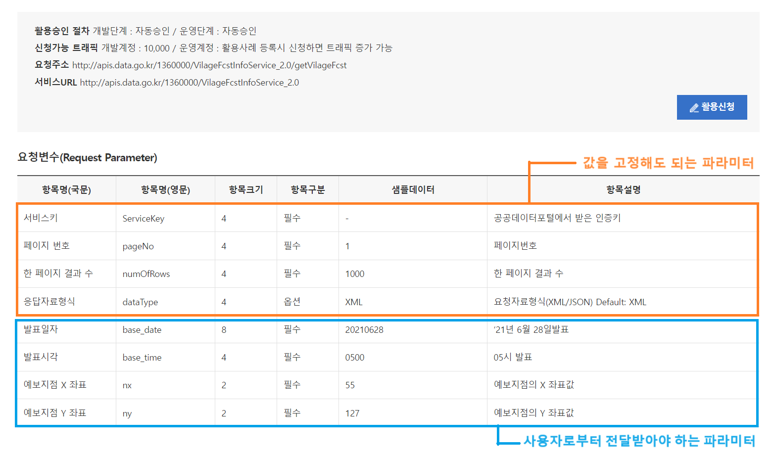 저희는 이 호출 옵션이라는 개념을 알고 있으므로 기상청 단기예보 API를 분석하여 사용자로부터 전달받을 파라미터, 고정 파라미터들을 구분하여 사용할 수 있습니다. 저는 다음과 같이 구분할 수 있을 것 같습니다.