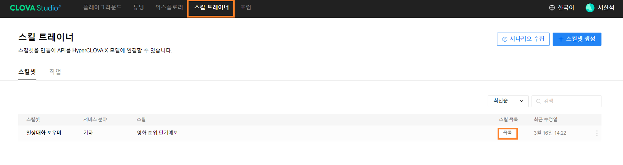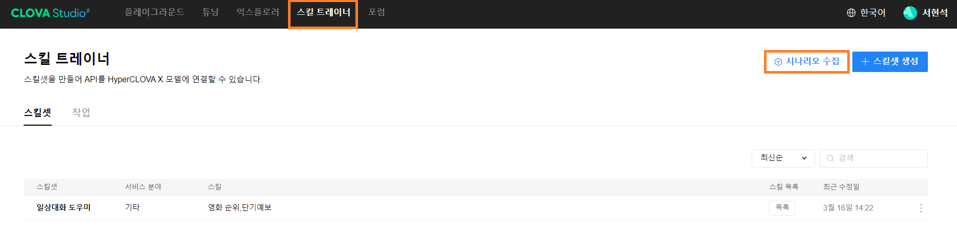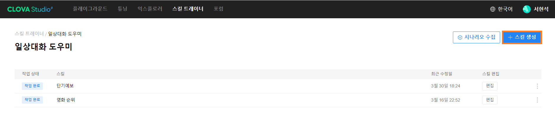 먼저 CLOVA Studio에 접속하신 뒤에 상단의 [스킬 트레이너] 탭을 클릭하시면 이전 포스팅에서 만들어 놓았던 일상대화 도우미라는 스킬셋이 나타나게 됩니다. 저는 이 스킬셋을 이용하여 스킬을 하나 추가하도록 하겠습니다.