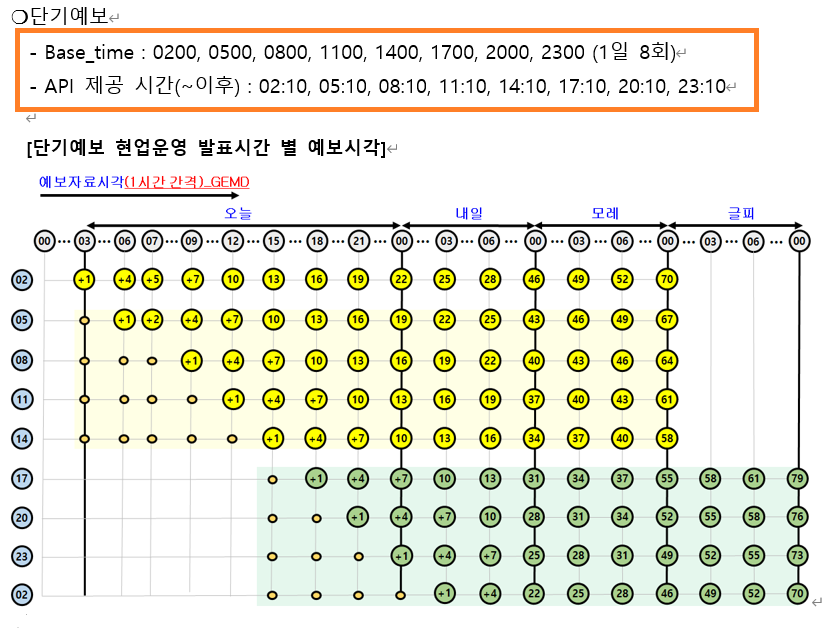 우선 base_date는 yyyymmdd의 날짜 포맷을 갖고 있고 base_time은 mmss의 날짜 포맷을 사용합니다. 그리고 여기서 주의할 점은 base_date와 base_time은 현재 날짜와 시간이 아닌 예보 발표일자와 시각을 의미합니다.