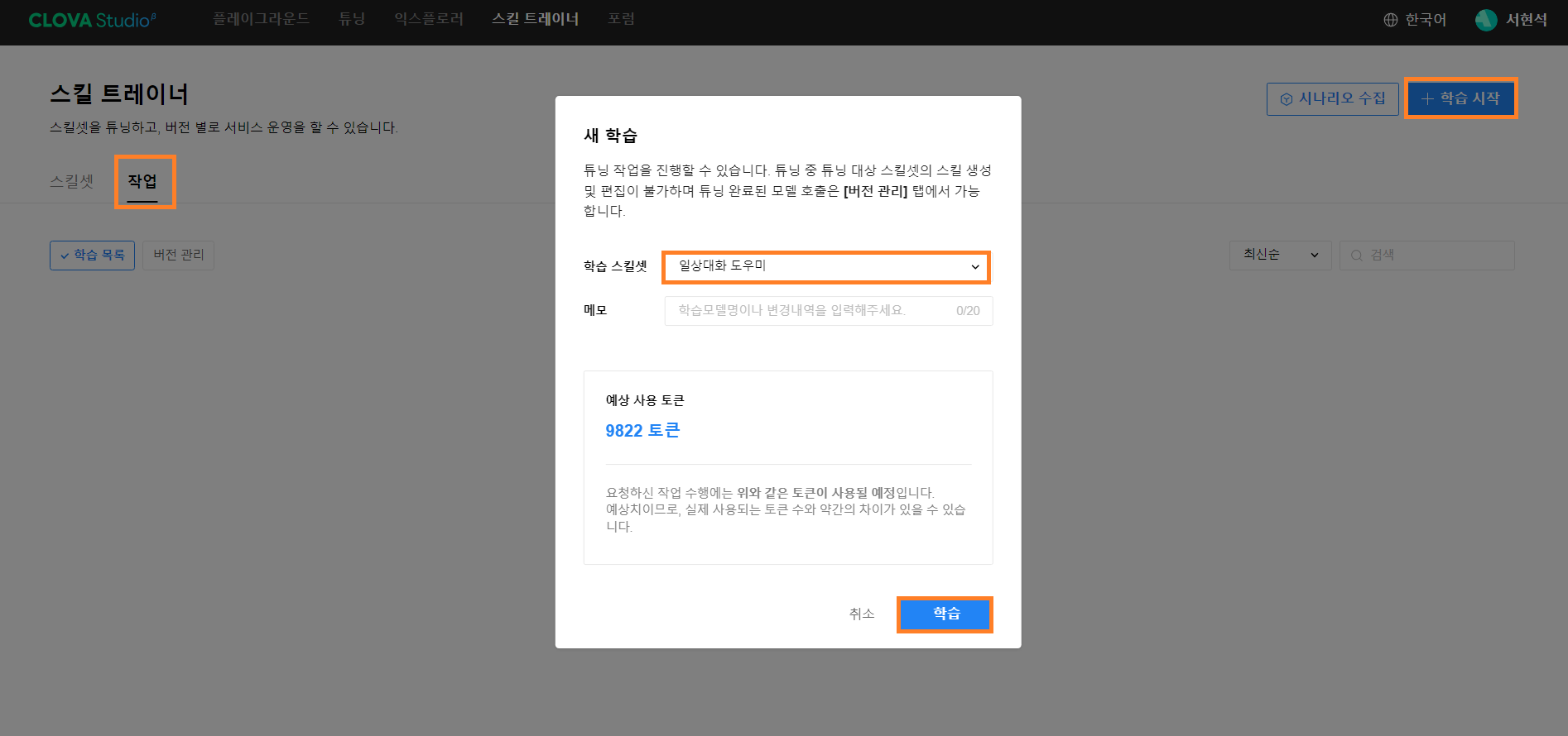 CLOVA Studio 시나리오 작업 목록 확인 이제 시나리오들이 준비되었으므로 모델을 학습하여서 실제로 사용자들이 사용할 수 있게 만들어보도록 하겠습니다. 스킬 트레이너의 [작업] 탭으로 이동하셔서 오른쪽 상단의 [+ 학습 시작] 버튼을 클릭하시고 스킬셋을 선택한 다음 [학습] 버튼을 클릭하시면 사용할 수 있게 됩니다.