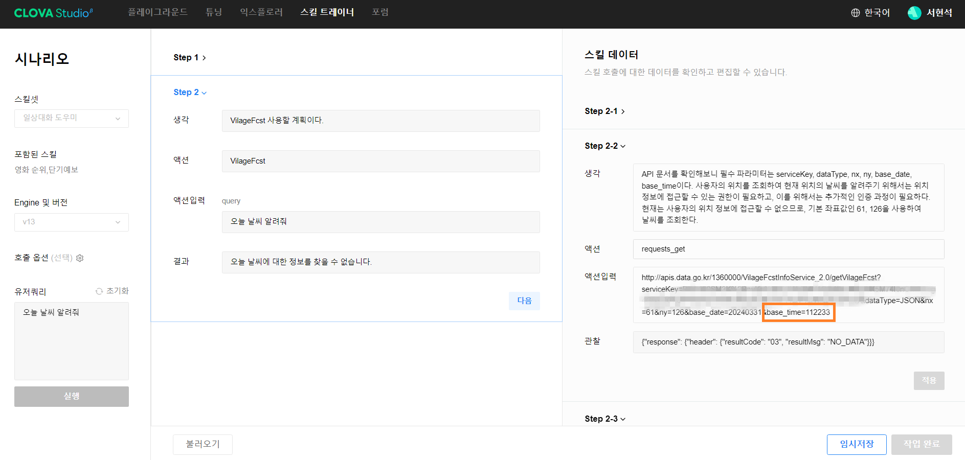 CLOVA Studio 시나리오 2단계 오류발견 확인해 보니까 base_time이 mmss 포맷이 아닌 이상한 형태의 값으로 들어가 있습니다. 이 부분을 알맞게 수정하여 다시 한번 호출해 보도록 하겠습니다. 현재 저의 시간으로 base_time을 계산해 보면 1100이 알맞겠네요.