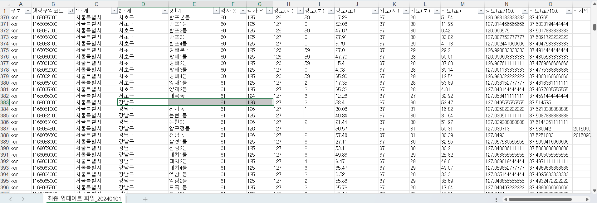 예보 날짜와 시간을 위한 프롬프트를 작성했다면 이제는 예보지점 X좌표와 Y좌표를 지정해줘야 하는데요. 이 X, Y 좌표 역시 일반적인 위도, 경도가 아닌 기상청에서 제공하는 X, Y 좌표를 기준으로 작성해야 합니다. 예를 들어 “오늘 강남 날씨 알려줘”라고 질문하는 경우 강남의 X, Y 좌표를 찾아서 지정해 줘야 됩니다.