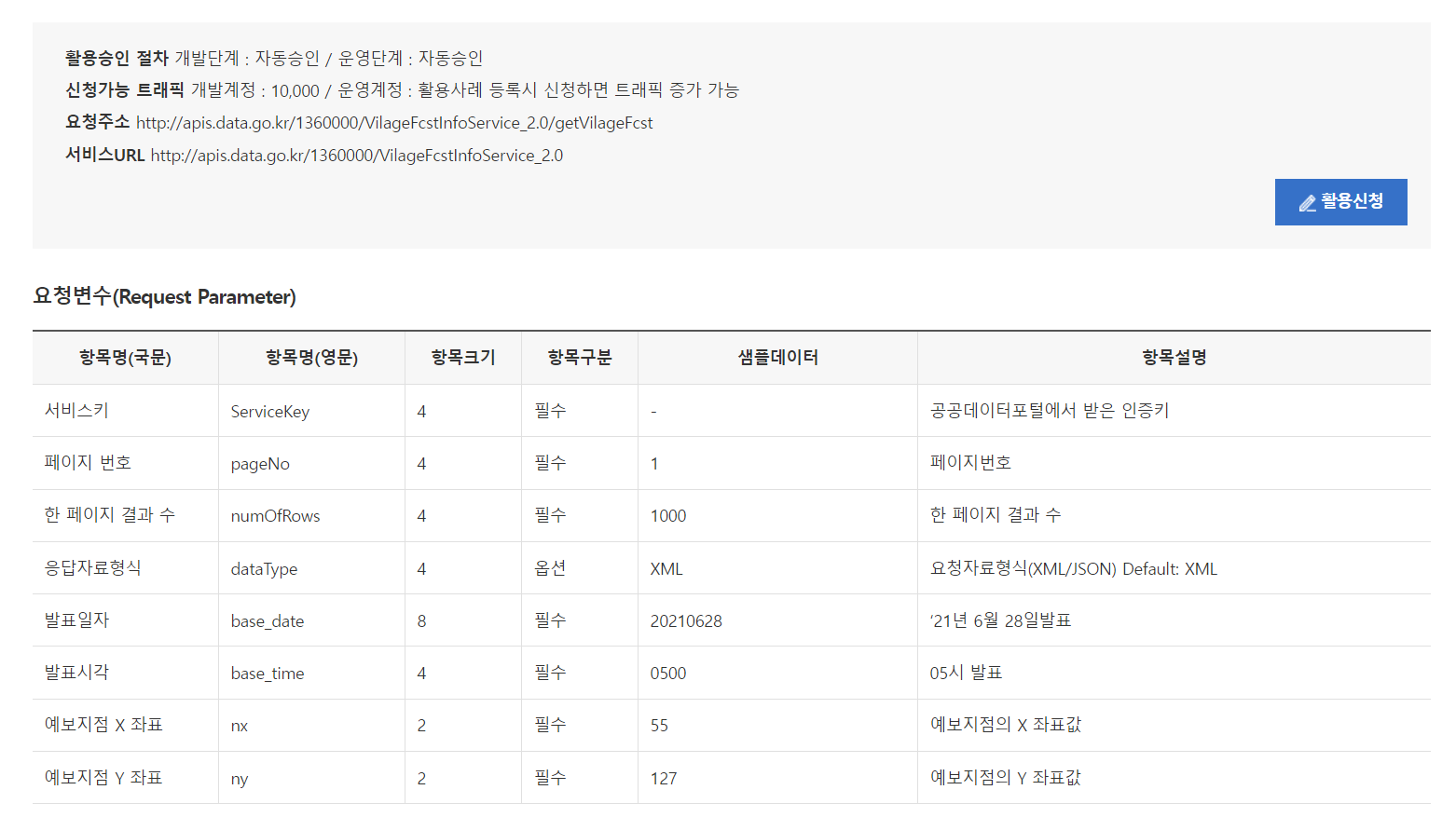 저는 미리 만들어놓은 일상대화 도우미 스킬셋에 단기예보라는 스킬을 등록하였습니다. API Spec은 공공데이터플랫폼에서 제공하고 있는 기상청 단기예보 API 스펙 정보를 토대로 구축하였습니다. 아래는 단기예보 API에 대한 스펙정보입니다.