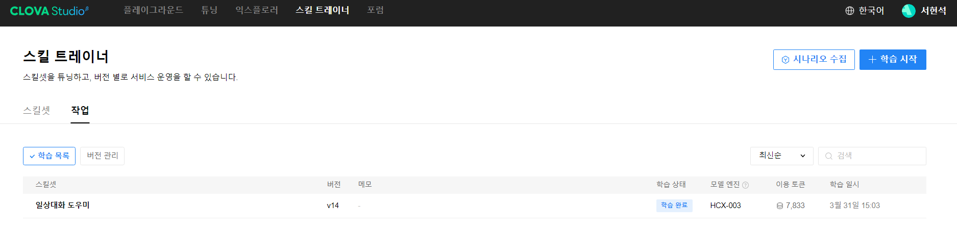 CLOVA Studio 스킬 학습하기 학습은 최대 6시간이 소요될 수 있다고 합니다. 저는 토큰 수가 많지 않았기 때문에 대략 30분 정도 소요되었습니다. 학습이 완료되면 다음과 같이 목록에 나타나게 됩니다.