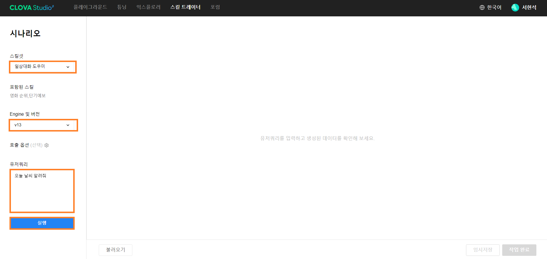 CLOVA Studio 시나리오 입력하기 호출 옵션까지 등록하셨다면 유저쿼리에 “오늘 날씨 알려줘”라는 질문을 등록하고 [실행] 버튼을 클릭합니다.