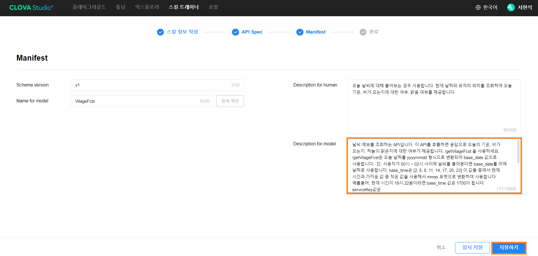 최종적으로 작성 완료된 프롬프트는 Manifest의 Description for model 부분에 넣어주시고 [저장하기] 버튼을 클릭하여 스킬 생성을 완료합니다.